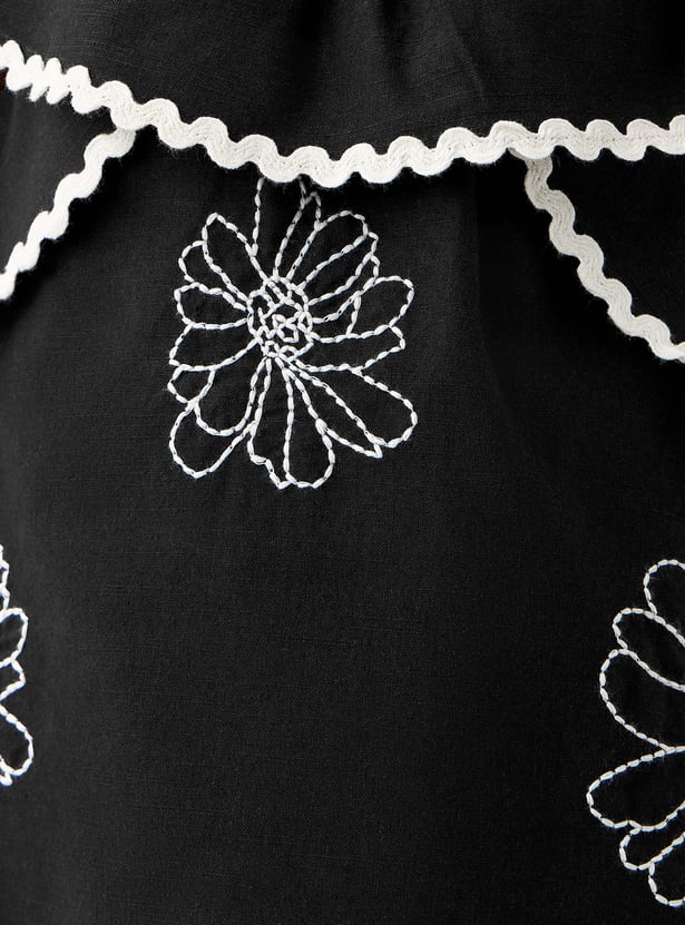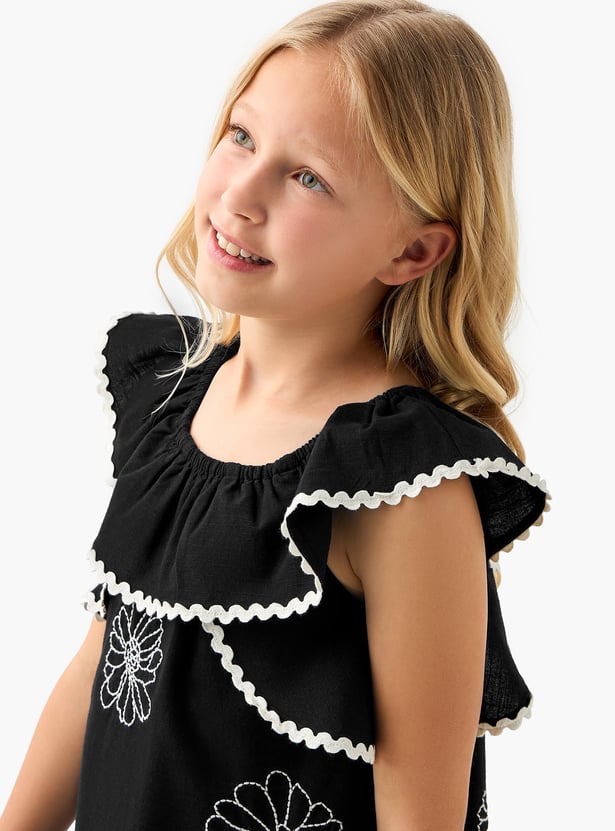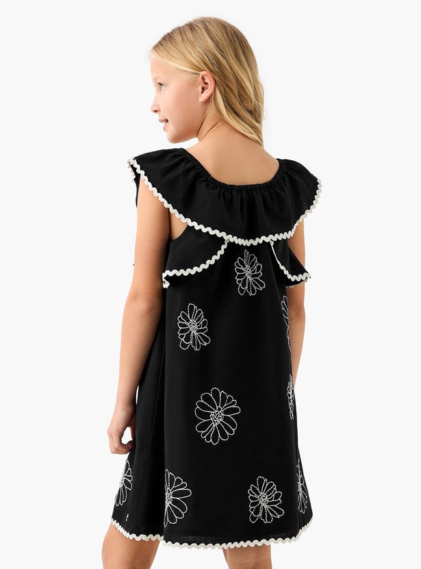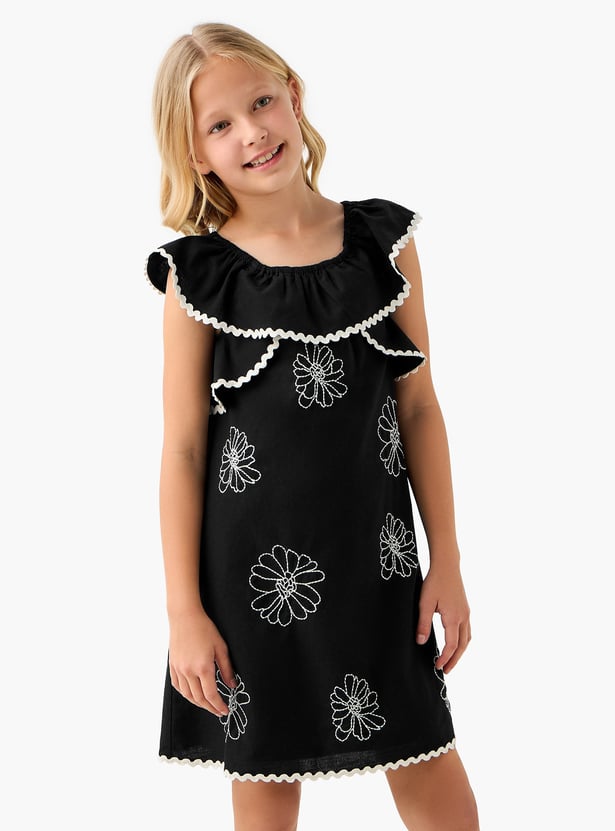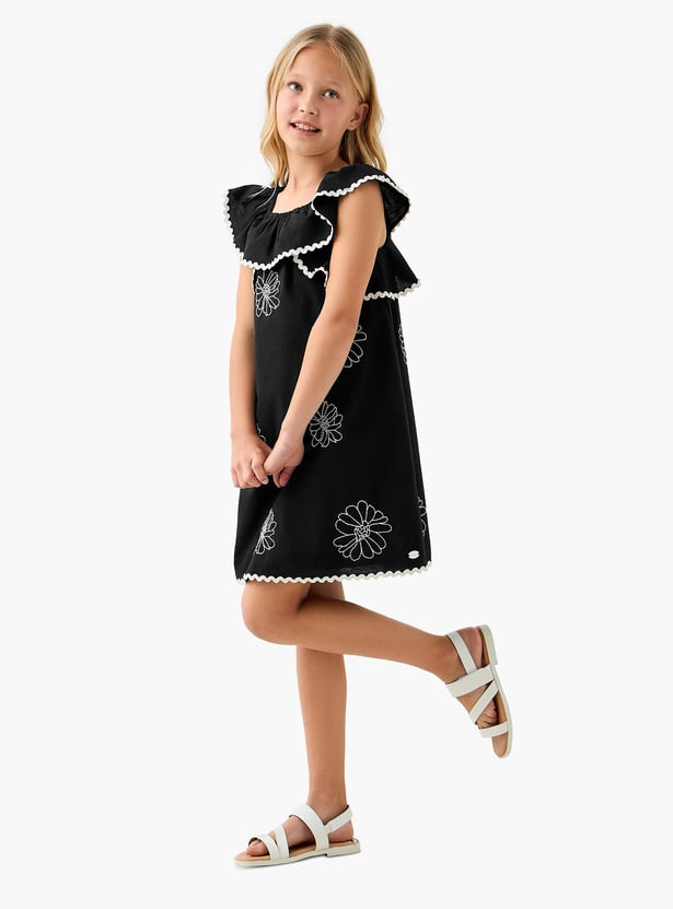This dress showcases delicate floral embroidery, adding a touch of elegance to its design. The ruffle detailing enhances its charming appeal, while the lace trim offers a refined finish. Crafted from soft, breathable fabric, it ensures all-day comfort. Perfect for special occasions or casual outings, this dress combines style and ease effortlessly.
