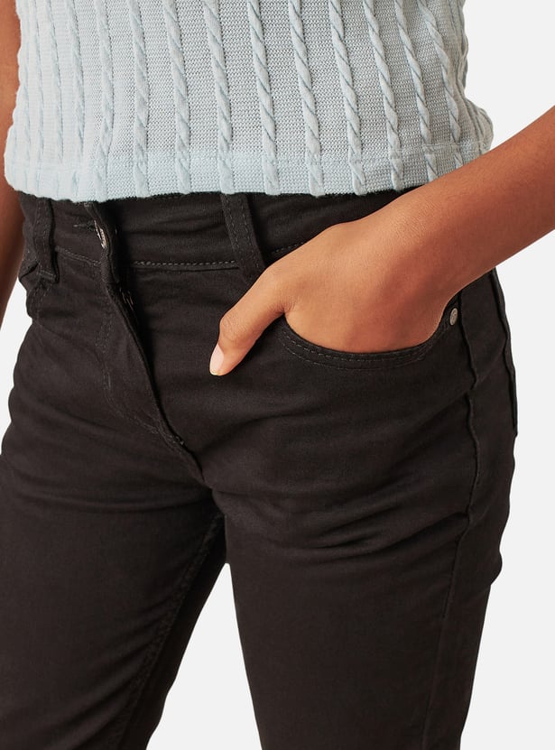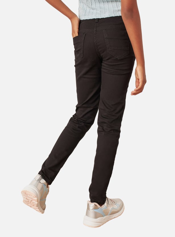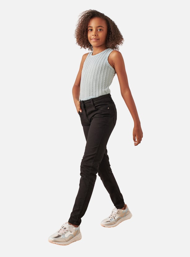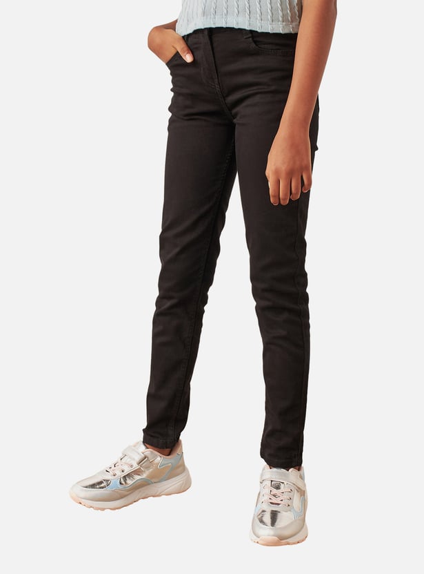 Choose this versatile pair of denim jeans by Juniors for your baby girl. Highlighting a bold hue, these jeans offer skin-breathability and a snug fit owing to the cotton blend material and perfect tailoring. The button closure gives the ease to wear.