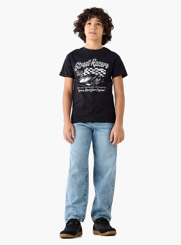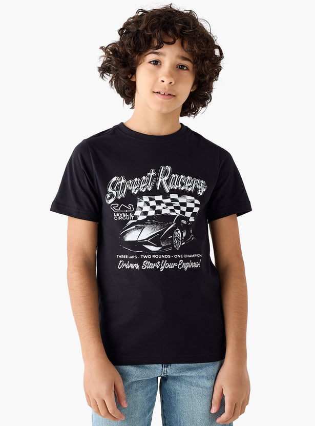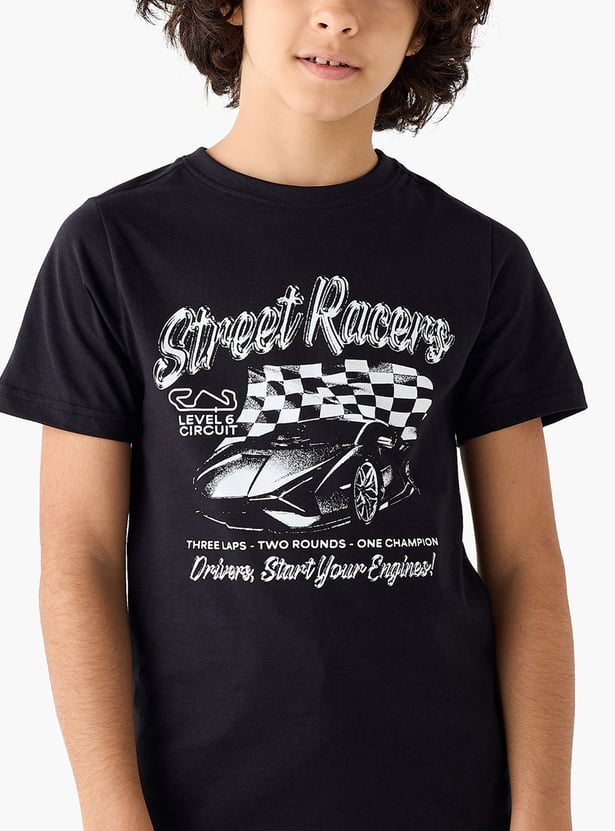 Elevate your young racer's wardrobe with this striking T-shirt, featuring a dynamic car design and racing flag. Crafted for comfort, this short-sleeved T-shirt is ideal for everyday wear, providing a relaxed fit for youngsters. The durable fabric ensures lasting wear, making it a practical addition to any boy's casual clothing collection.