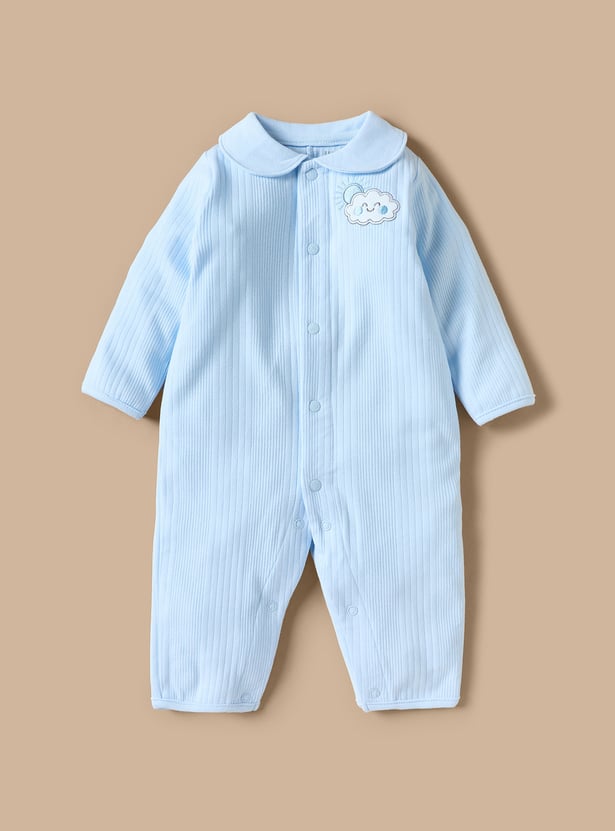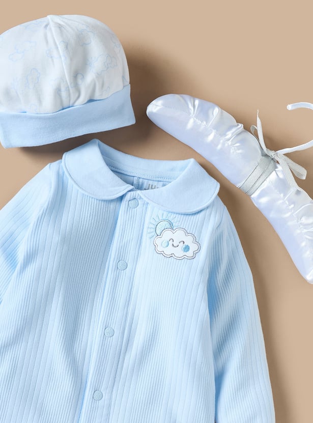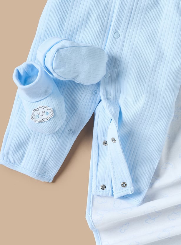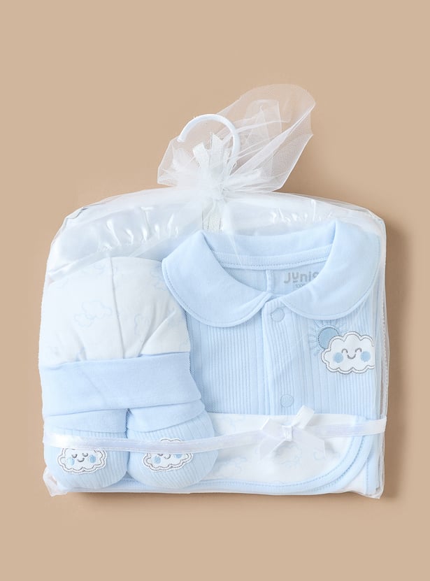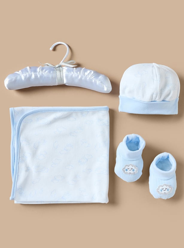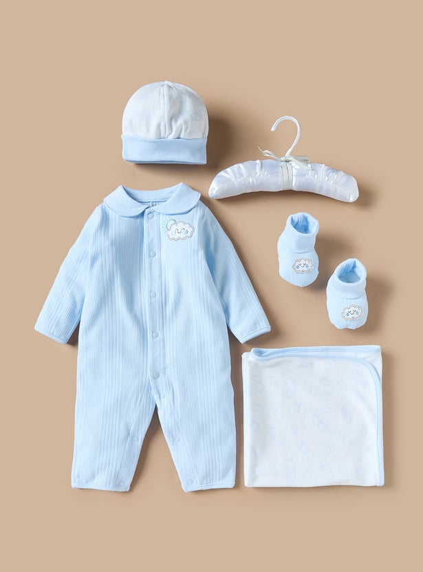 Comfort and style come together in this five-piece clothing set designed for baby boys. Crafted from breathable fabric, the set includes a long-sleeved sleepsuit, a cute cap, booties, a blanket and a hanger. The textured pattern adds a touch of charm, while the hue will make your little one stand out. This set is perfect for both casual wear and special occasions.