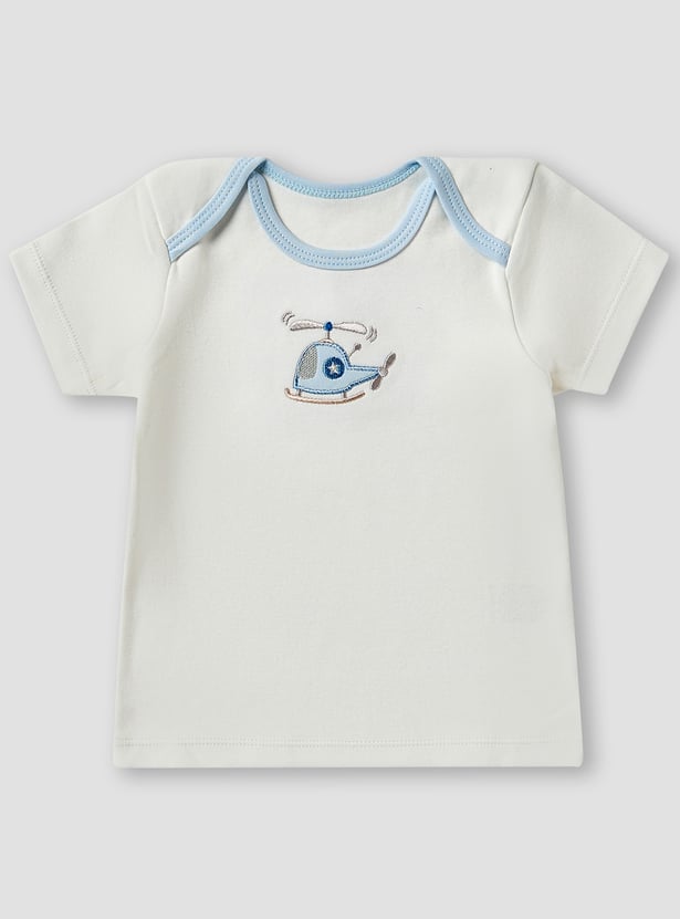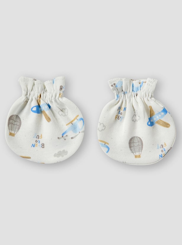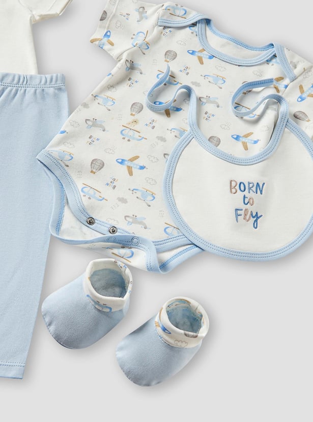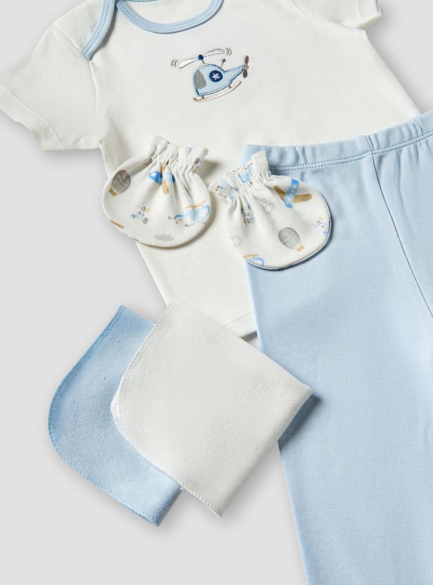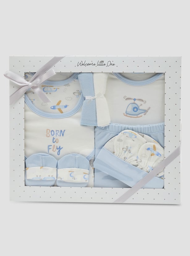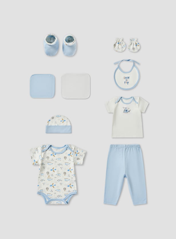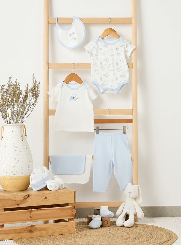 Surprise new parents with this beautifully curated gift set, designed especially for baby boys. Featuring a t-shirt, bodysuit, pyjamas, beanie, bib, mittens, booties, and soft washcloths, each item is adorned with endearing prints and fine embroidery. Made from soft, breathable fabric, the set offers gentle comfort for delicate newborn skin. With its harmonious design and thoughtful details, it adds elegance and practicality to everyday essentials. A perfect fusion of charm and functionality for a newborn's first wardrobe.