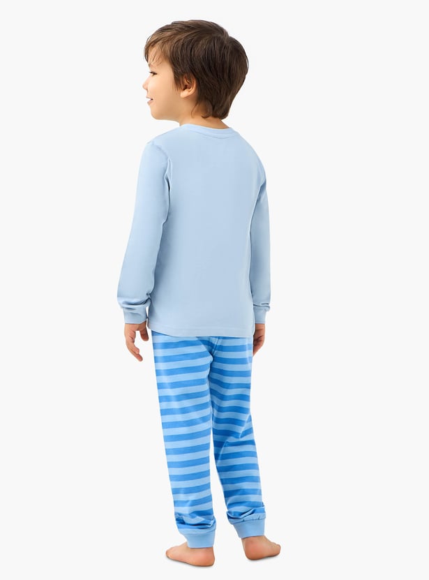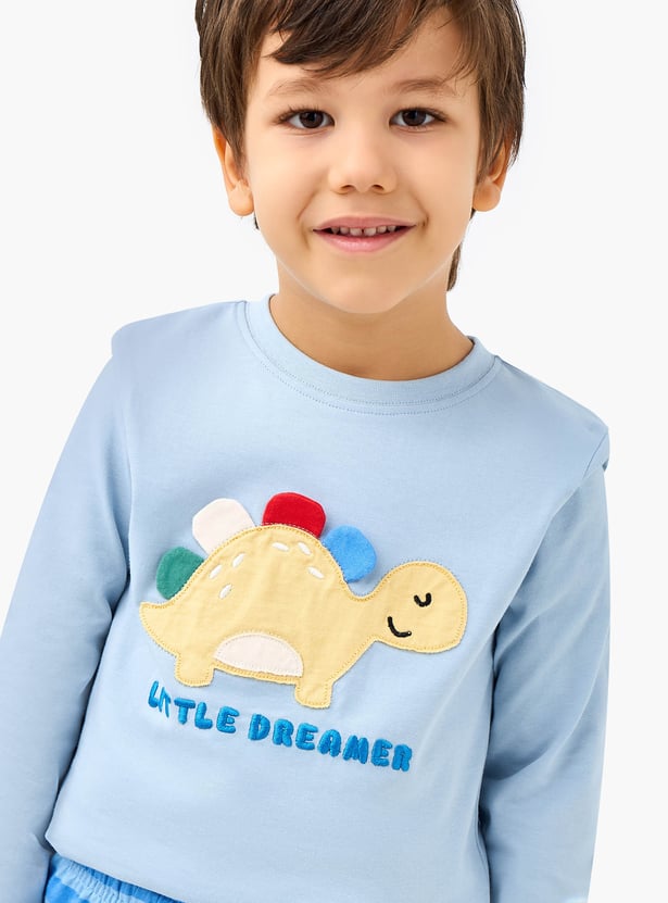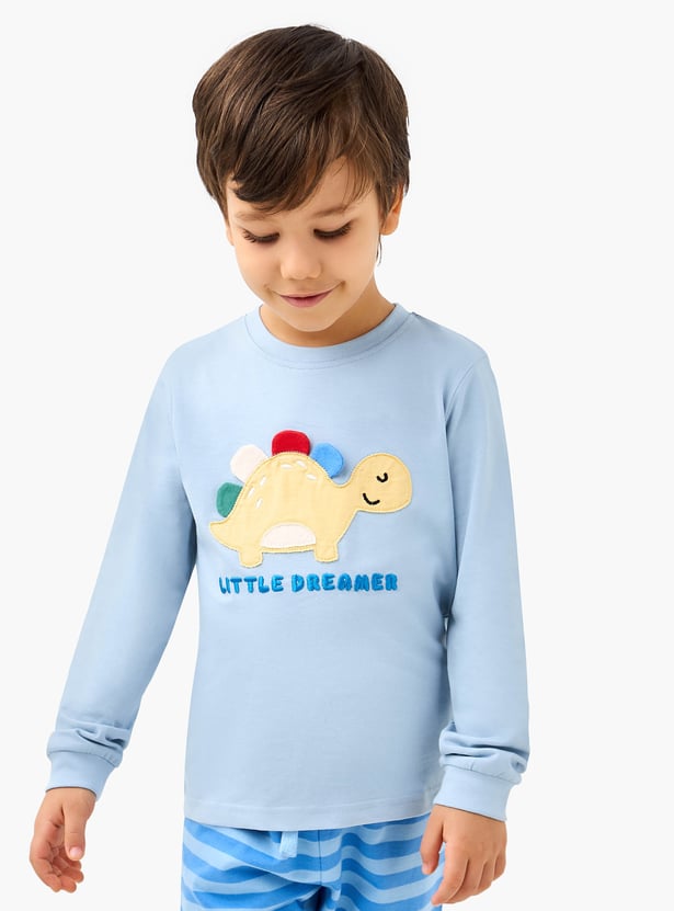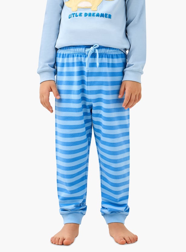 This comfortable joggers set features a charming dinosaur applique, perfect for bedtime adventures. The soft, breathable material ensures a peaceful night's sleep. The striped joggers and long-sleeved tee offer a snug fit, ideal for cooler evenings. This adorable pyjama set makes bedtime fun and stylish.