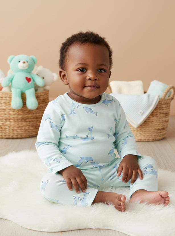 This charming dolphin print pyjama set for babies features a long-sleeved top and coordinating bottoms, crafted from soft, breathable fabric. The gentle fabric ensures maximum comfort for delicate skin, making it ideal for peaceful sleep or relaxed daytime wear. Snap button closures on the shoulder of the top facilitate easy dressing and changing, providing convenience for parents. This delightful baby pyjama set offers both comfort and adorable style.