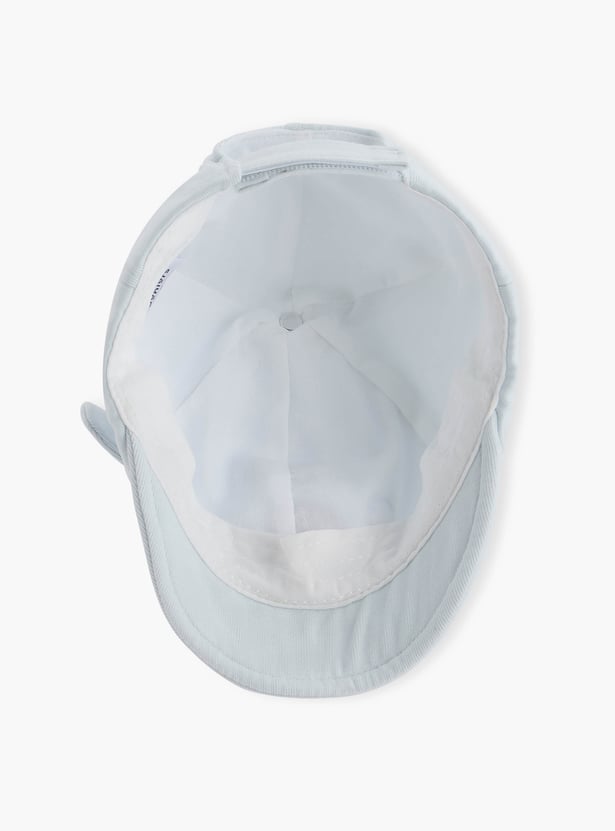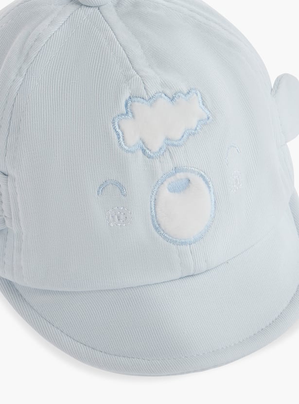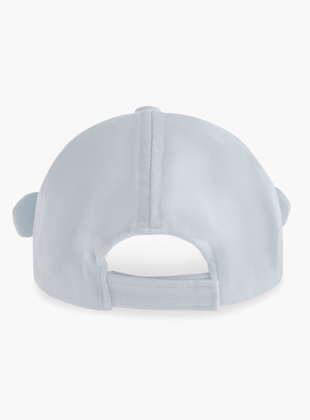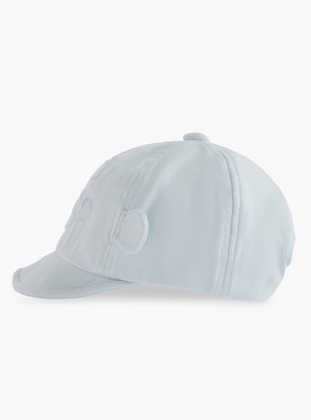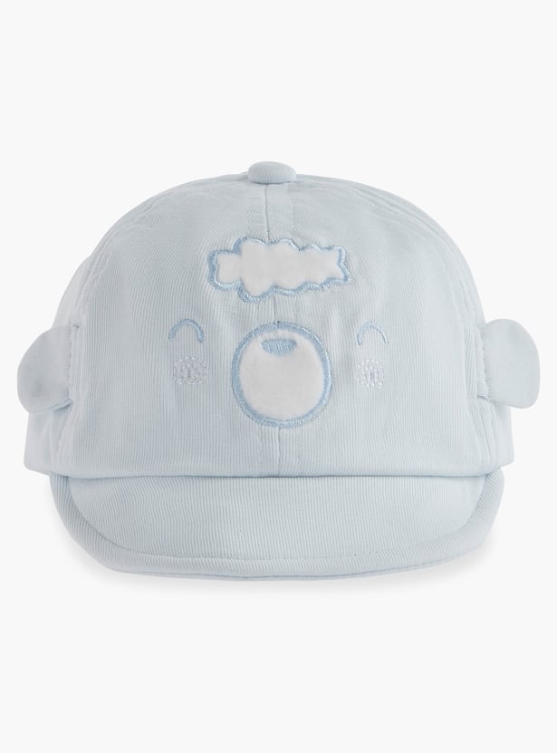 This adorable cap, crafted from soft fabric, features an embroidered bear face and ear appliques, adding a touch of charm to your little one's outfit. The cap provides comfortable protection from the sun. This soft and breathable cap ensures gentle wear for your baby's delicate skin.