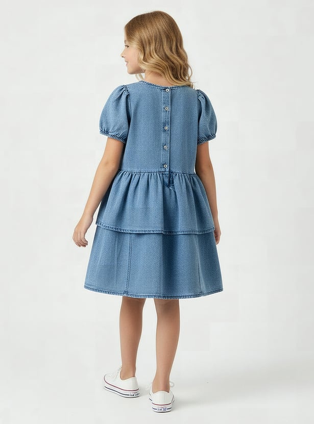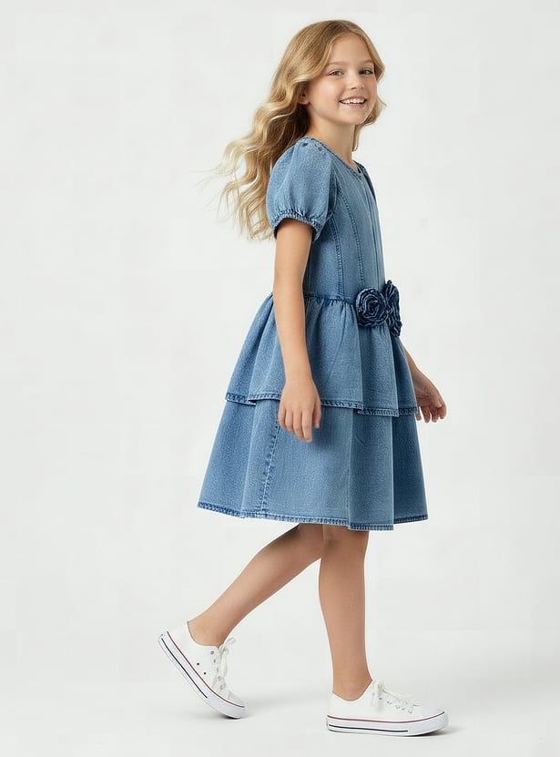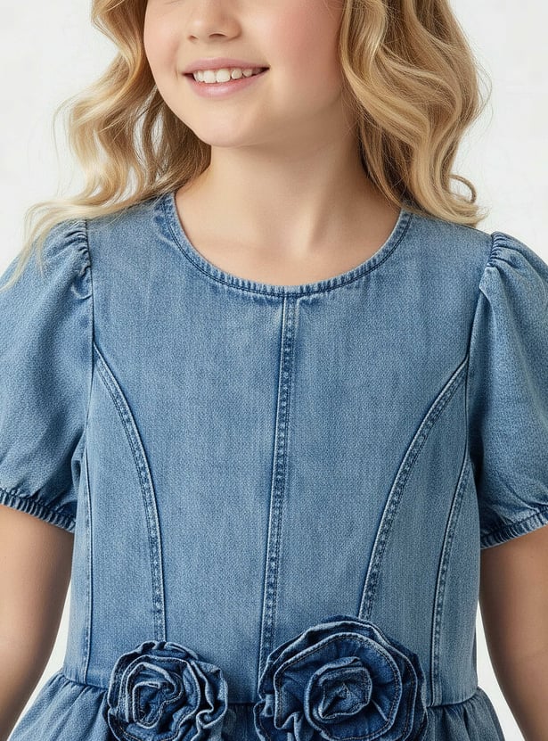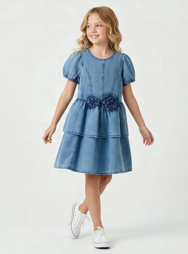 This juniors floral applique denim dress adds a sweet touch to everyday outings. Designed with soft puff sleeves, delicate floral appliqué detailing at the waist, and a gently flared silhouette, it offers both comfort and charm for all-day wear. The full button closure at the back ensures easy dressing, making it a practical choice for various occasions. Crafted from soft, durable denim fabric.