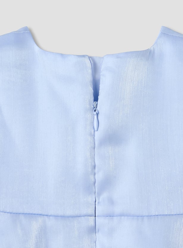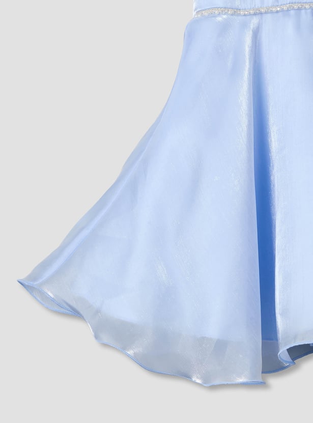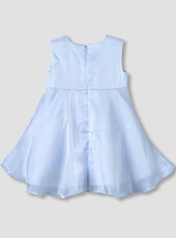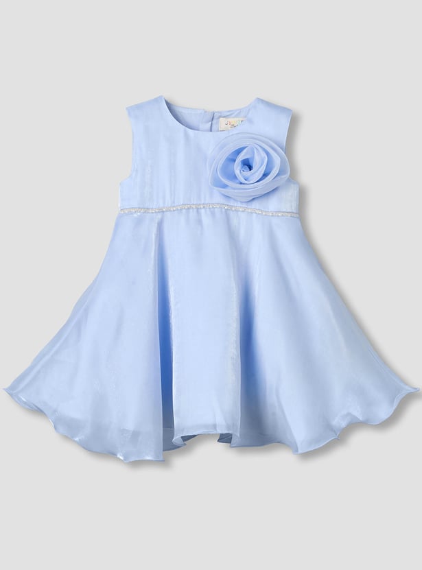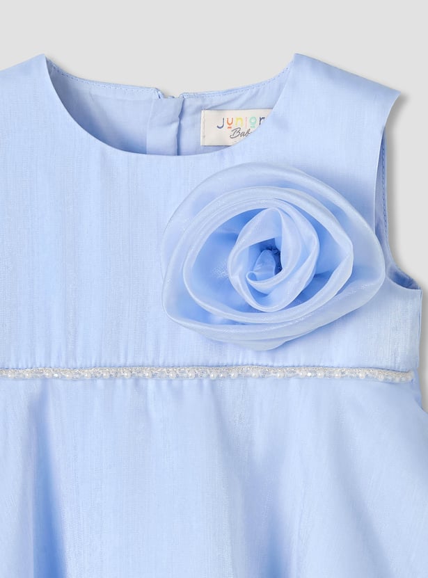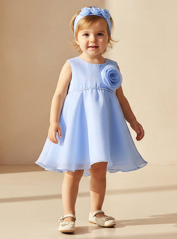 Dress your little one in a bloom of elegance with this charming floral embellished dress, perfect for special celebrations. Designed with a sleeveless silhouette for comfort, it features delicate floral appliqué detailing on the bodice and a subtle beaded waistline that enhances the flowing skirt. Crafted from soft, comfortable fabric, it allows easy movement while keeping her at ease throughout the day. Complete with a matching headband, this beautiful outfit is ideal for parties and festive gatherings where she’s sure to shine.