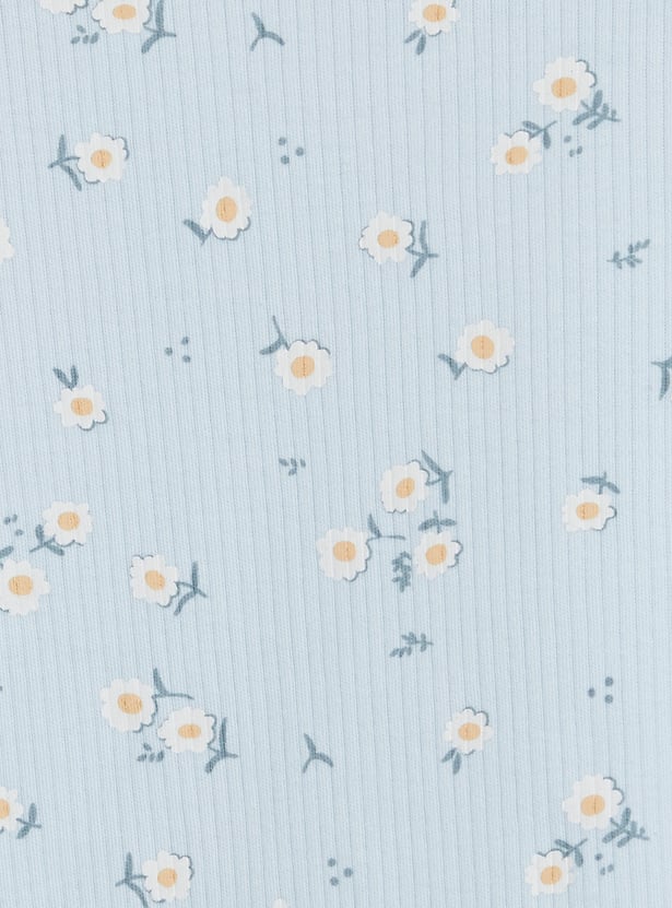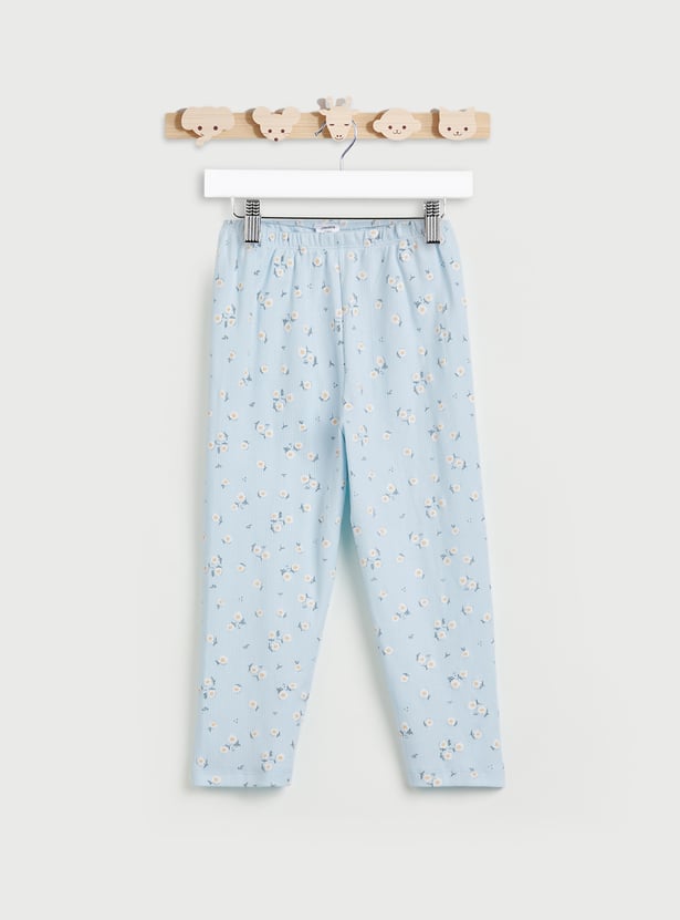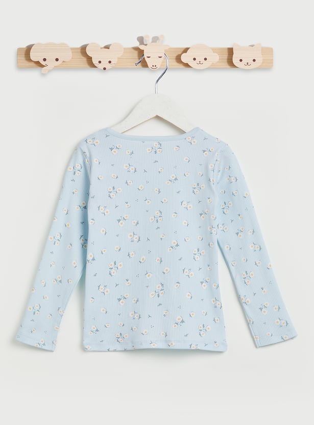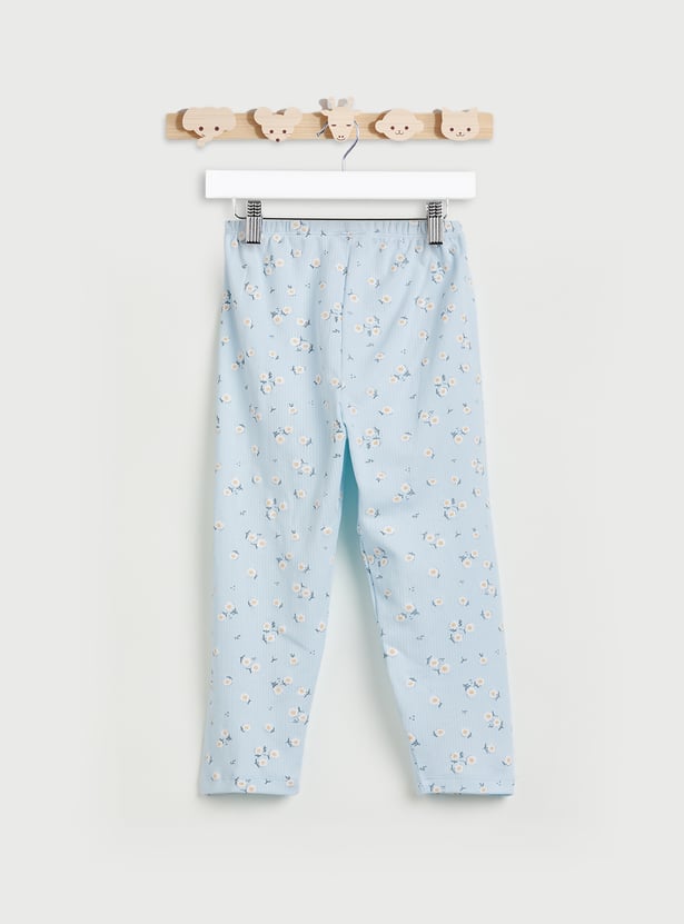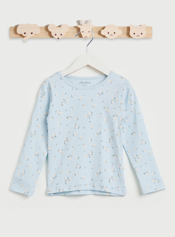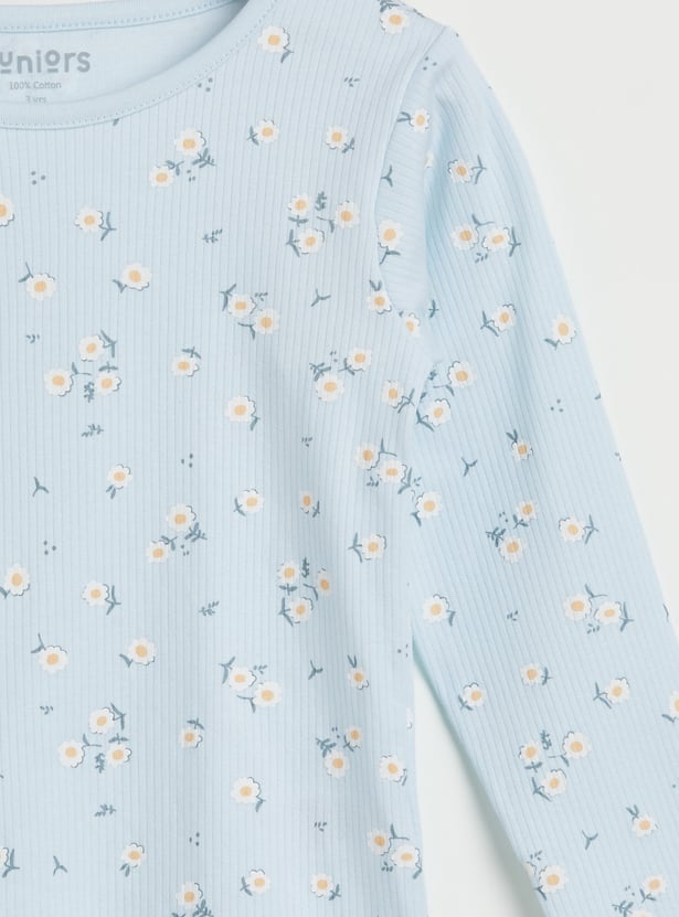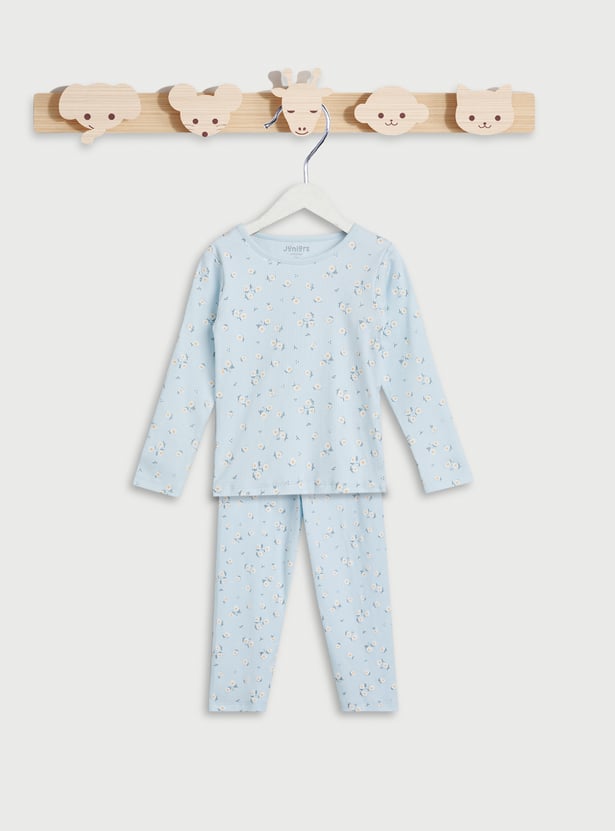 Wish her sweet dreams with this pyjama set featuring floral prints and made from soft fabric for maximum comfort. It includes a top with a round neck, full sleeves, and a ribbed knit pattern. The pair of pyjamas includes a comfy elasticated waist.