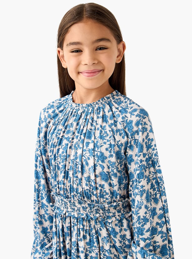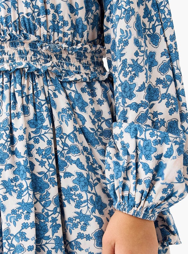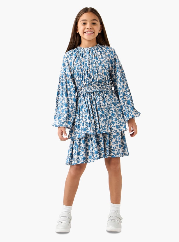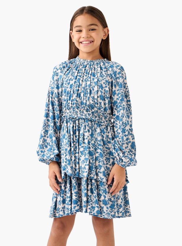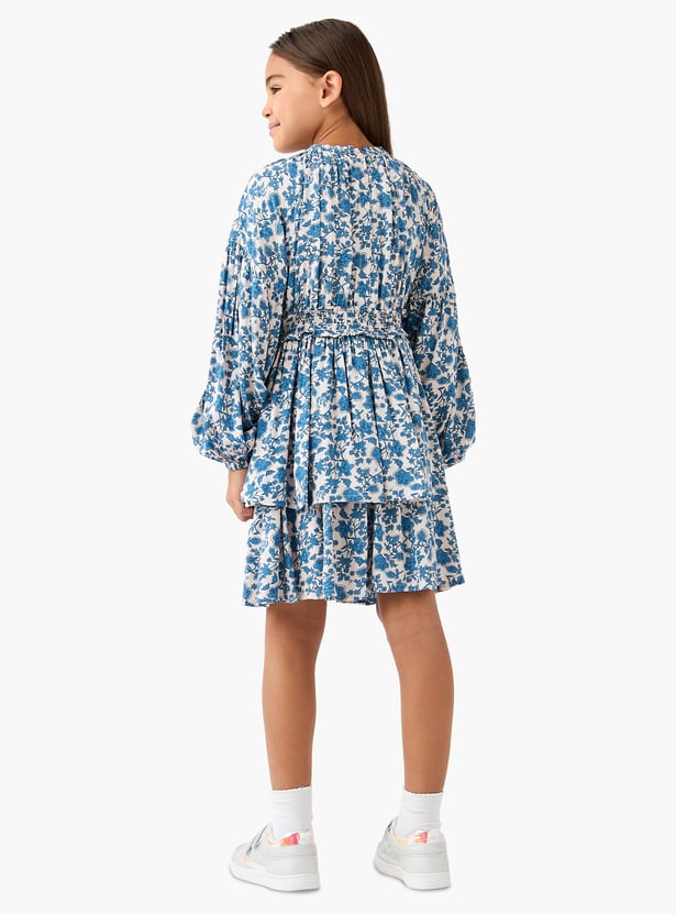 Juniors Floral Print Tiered Dress with Long Sleeves
