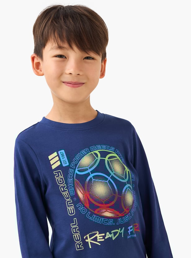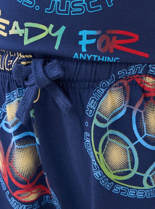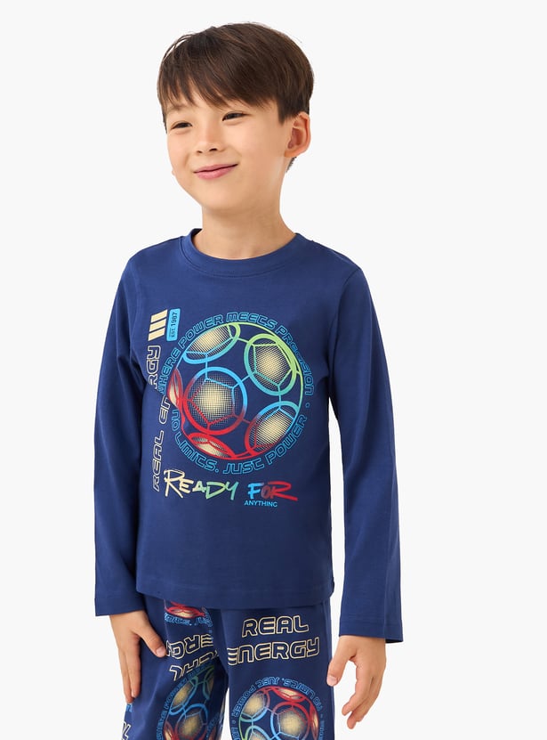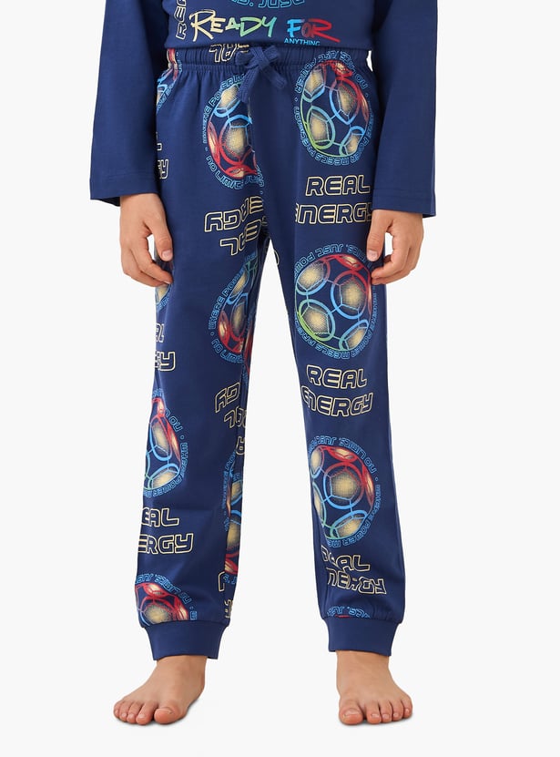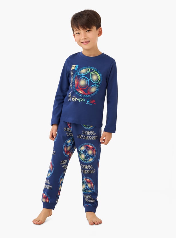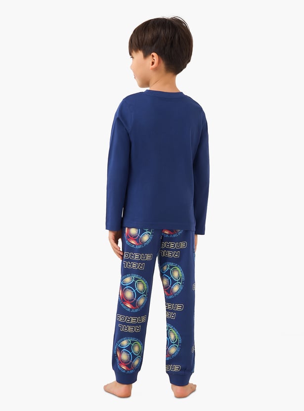 Send your little sports fan off to dreamland in this fun boys’ football print pyjama set, designed for ultimate comfort and restful sleep. This two-piece set features a long-sleeved top and matching trousers, both adorned with vibrant football graphics for a playful, energetic look. The elasticated waistband on the trousers ensures a secure yet comfortable fit, allowing unrestricted movement throughout the night. Crafted from soft, breathable fabric, this boys’ sleepwear combines fun design with practical comfort for every young football enthusiast.