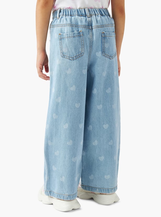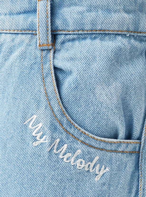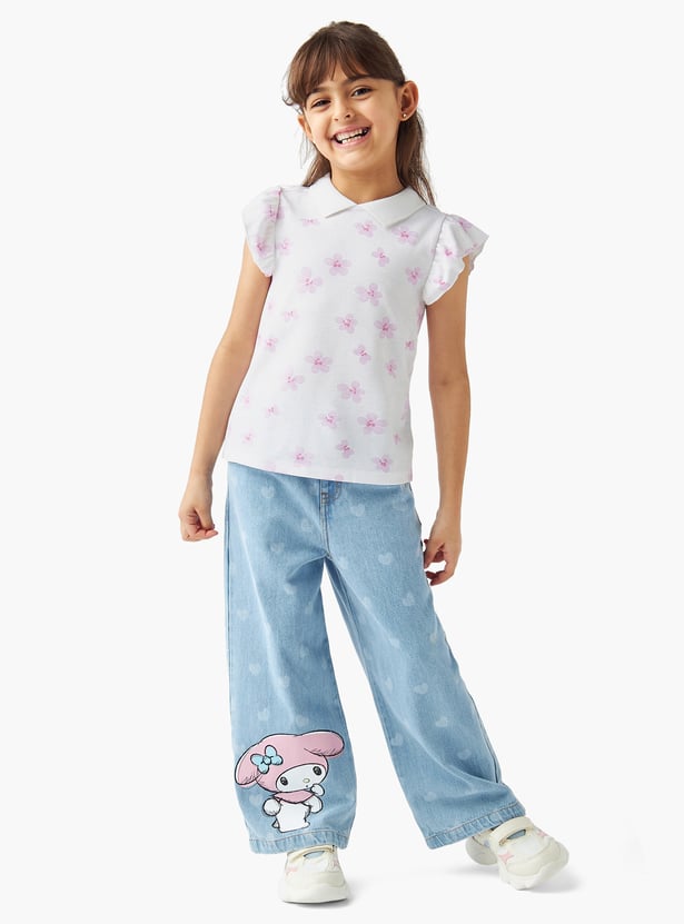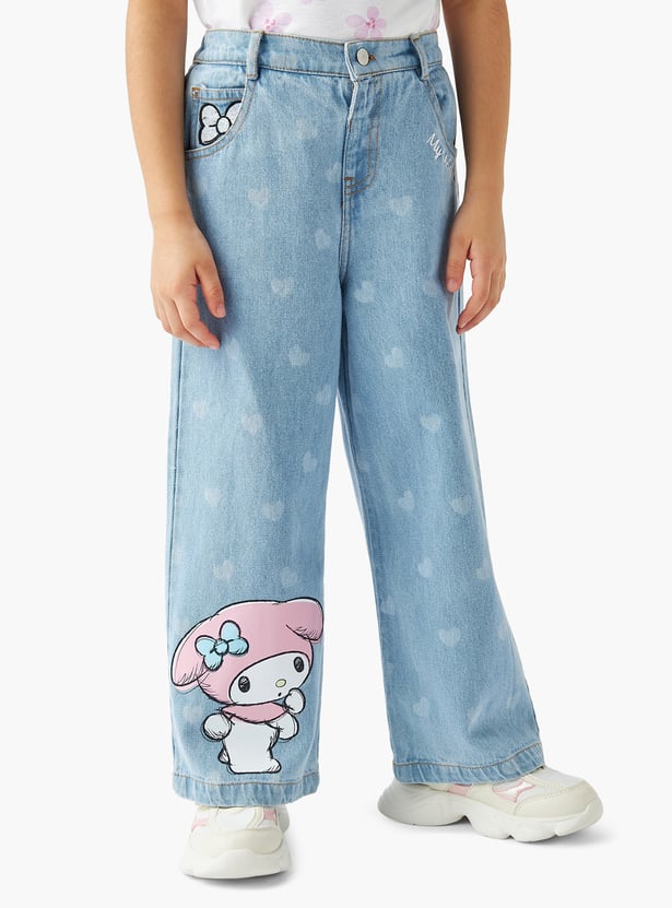 These charming print wide-leg jeans are perfect for young fans. The light wash denim features an all-over heart print and a large My Melody embroidered detail, adding a touch of whimsy to any outfit. These comfortable and stylish jeans are ideal for everyday wear. Crafted from durable denim, these wide-leg jeans offer a relaxed fit, ensuring lasting comfort for your little one.