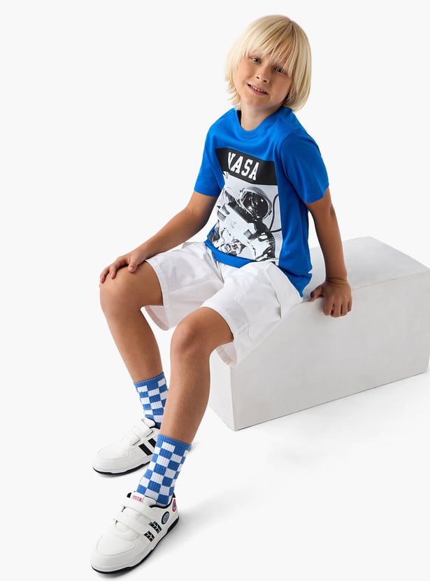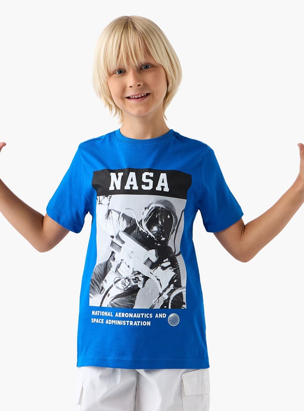 This boys' t-shirt features a cool NASA graphic print and a classic crew neck with short sleeves. Made from soft fabric, it ensures comfort and breathability for all-day wear. Perfect for young space enthusiasts, this t-shirt combines fun design with everyday practicality.