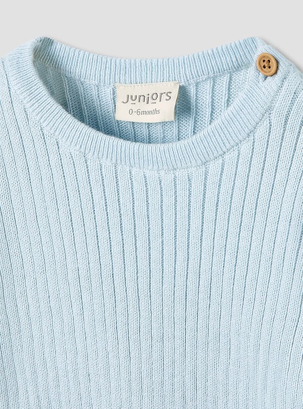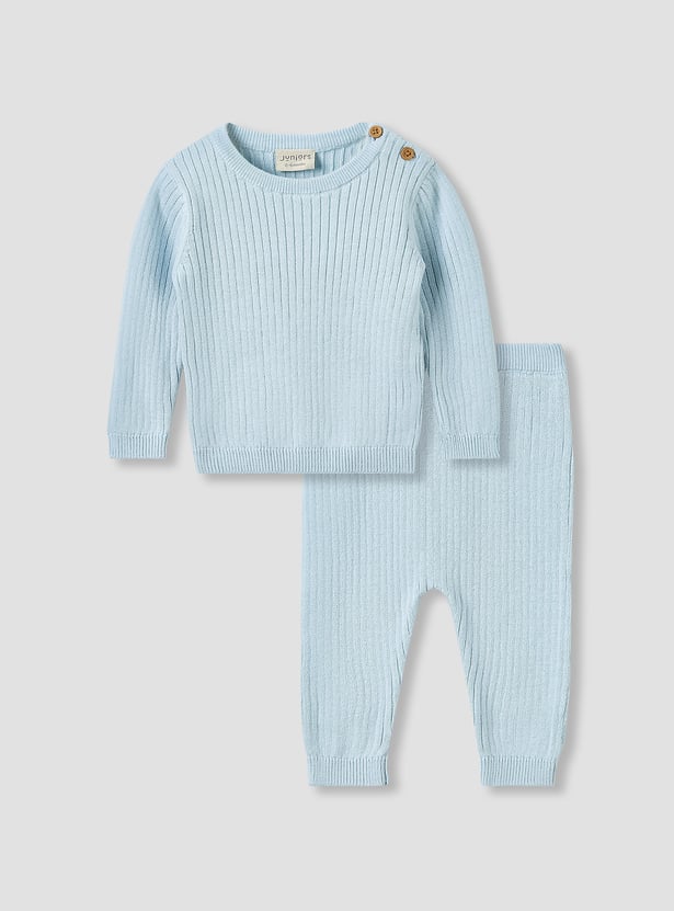Discover ultimate comfort for your little one with this charming ribbed knit pyjama set. Crafted from soft knitwear, this two-piece ensemble ensures a gentle feel against delicate skin, promoting peaceful sleep. The long-sleeved top features convenient shoulder button closures for effortless dressing, while the coordinating trousers offer a snug yet comfortable fit. This pyjama set is ideal for keeping babies cosy and warm throughout the night, making it a practical addition to any baby's wardrobe.
