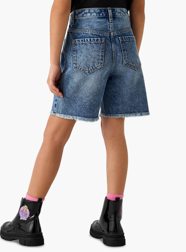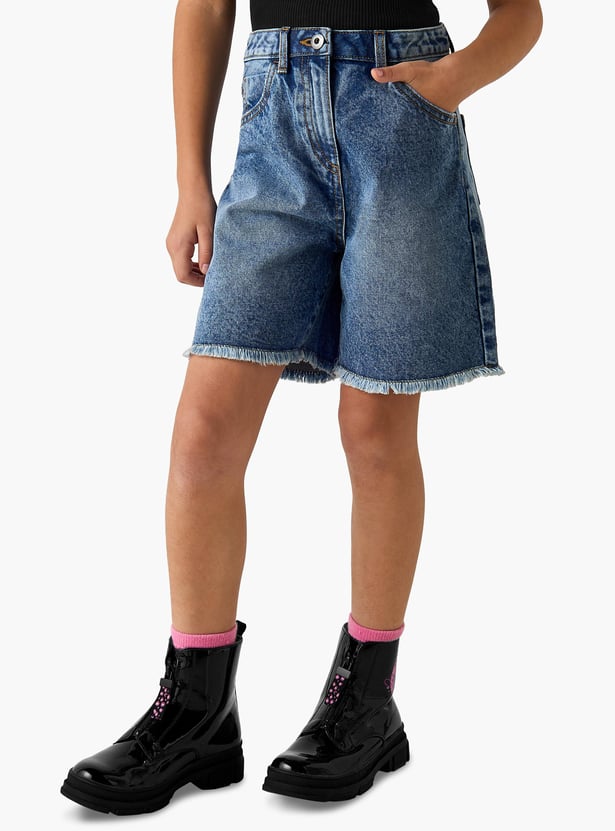 Juniors Solid Denim Shorts with Pockets and Frayed Hem