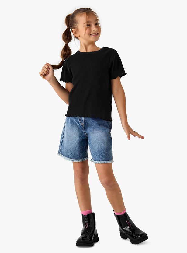 These shorts offer a classic, timeless style with a modern twist. Crafted from denim, they feature functional pockets for practicality and a frayed hem for a touch of casual flair. The solid tone ensures versatility, making them ideal for various tops. Perfect for casual wear, these shorts provide comfort and style for young girls.