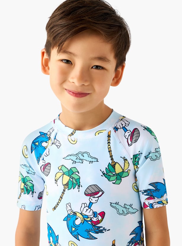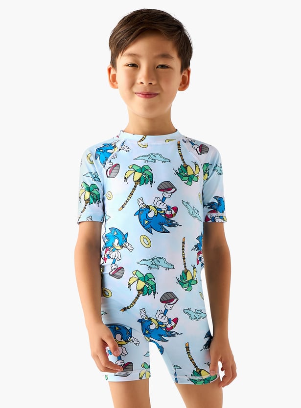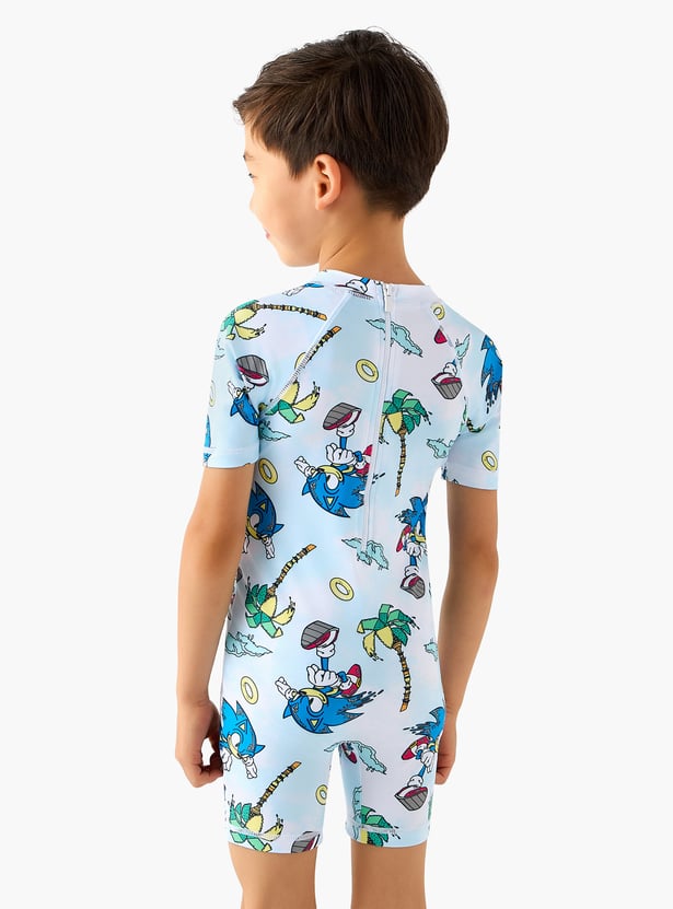 Prepare your young adventurer for aquatic fun with this swimsuit, featuring an exciting Sonic the Hedgehog print. This short-sleeved profile offers a mock neck and a back zip to provide full coverage. It is crafted from a comfortable and quick-drying fabric.