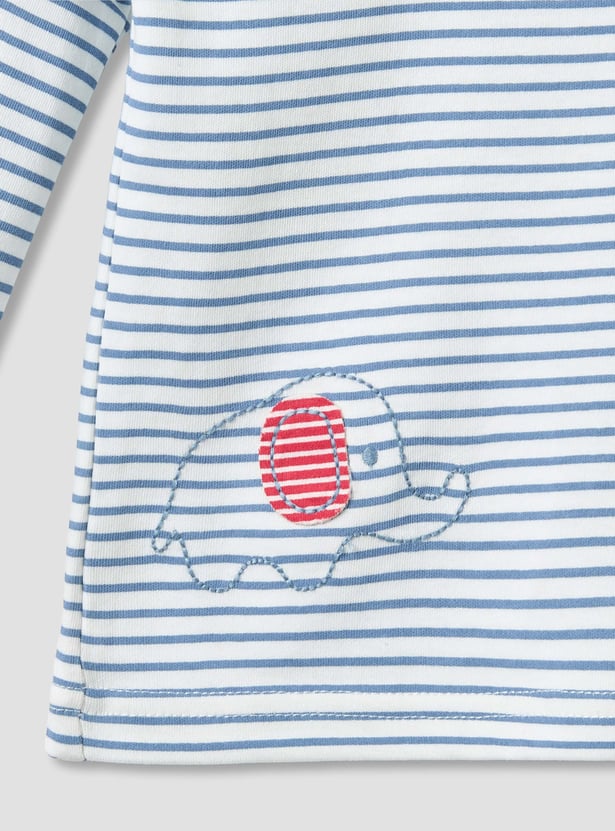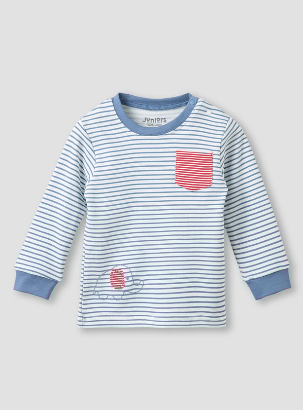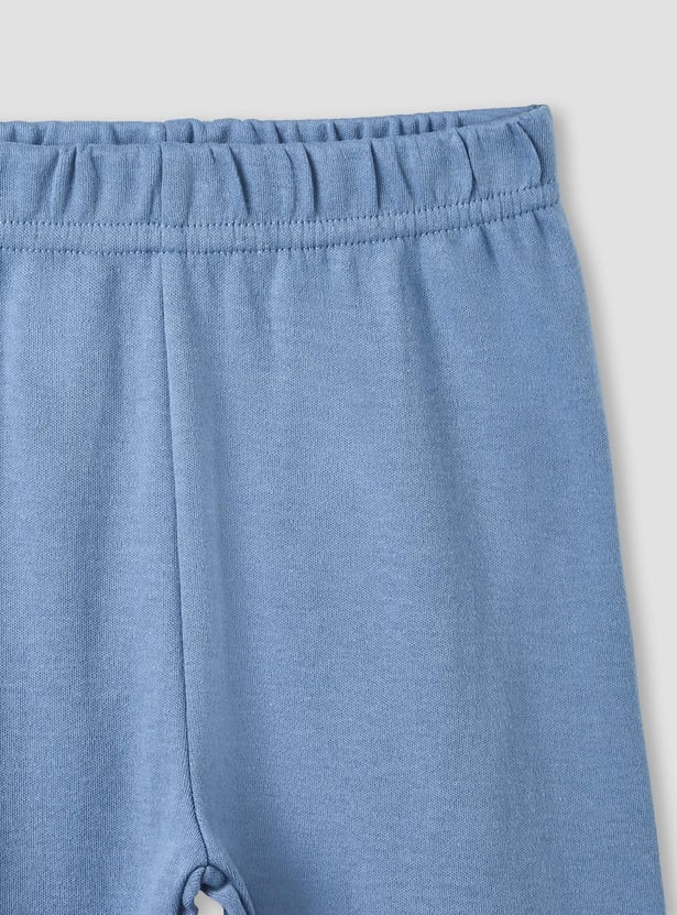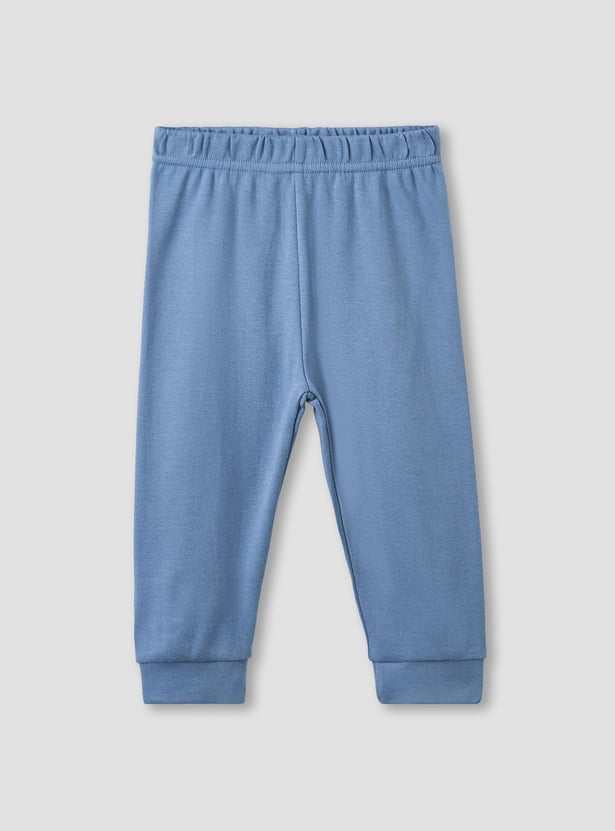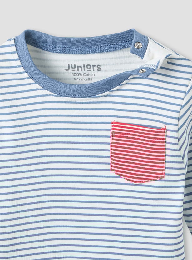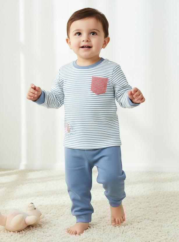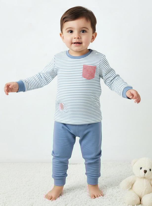 This charming joggers set for boys features a striped long-sleeve t-shirt and coordinating solid joggers, ensuring comfort and style for bedtime. Crafted from soft, breathable fabric, this two-piece set provides a gentle feel against delicate skin, promoting restful sleep. The t-shirt includes a playful embroidered motif and a contrasting chest pocket, adding a delightful touch to this essential sleepwear.