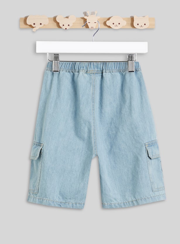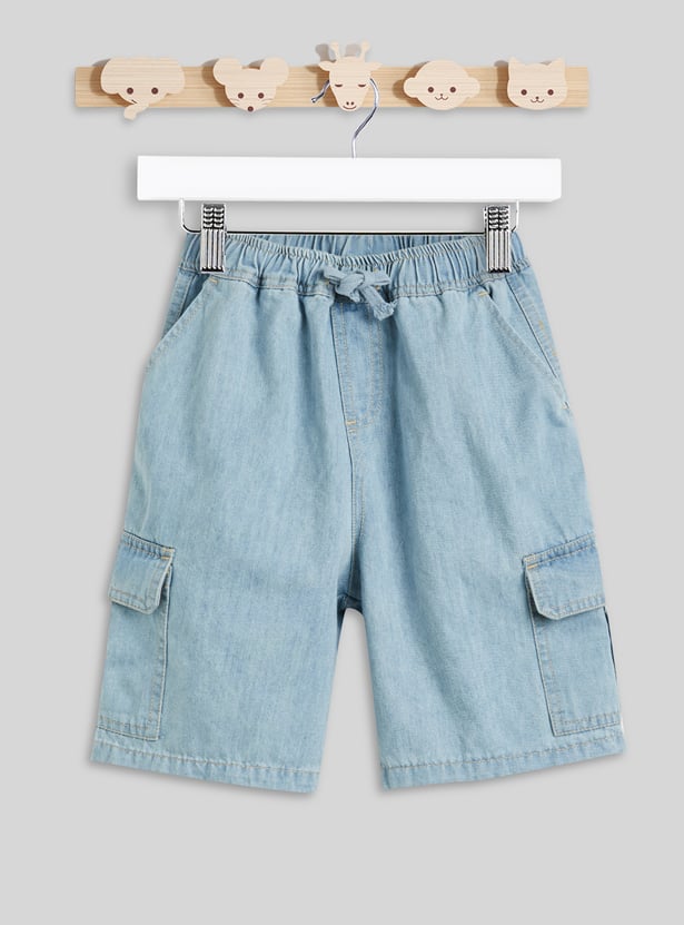 These denim cargo shorts offer a practical and comfortable style for everyday wear. Designed with a drawstring waist, washed finish, and cross pockets, they provide a secure and adjustable fit. The flap pockets add a classic cargo touch while offering extra storage for small essentials. It is crafted from soft fabric.