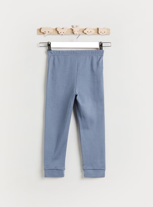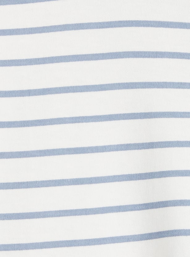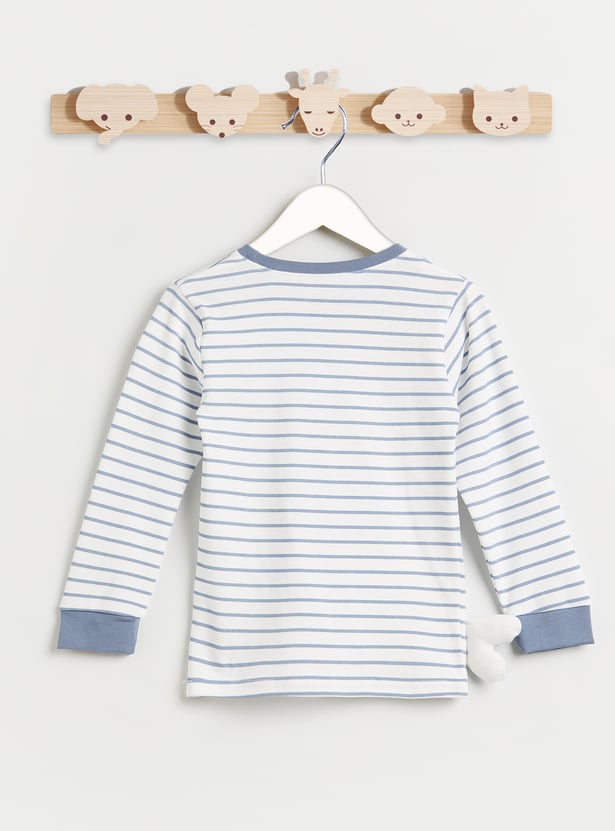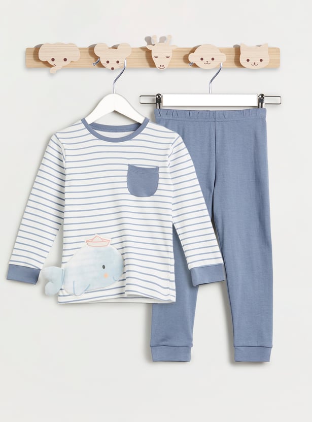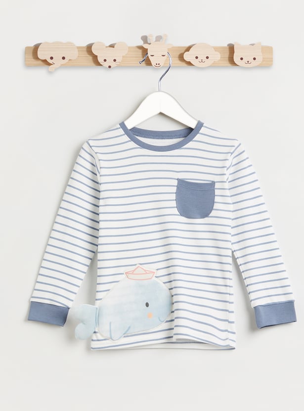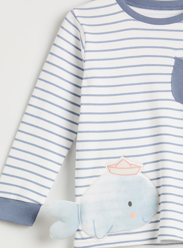 Add playful charm to your casual collection with this striped whale applique T-shirt and joggers set. The T-shirt features a classic crew neck, full sleeves, and a handy patch pocket, enhanced with a fun whale applique for a touch of whimsy. Paired with joggers designed with an elasticated waist, this set blends comfort with cheerful style.