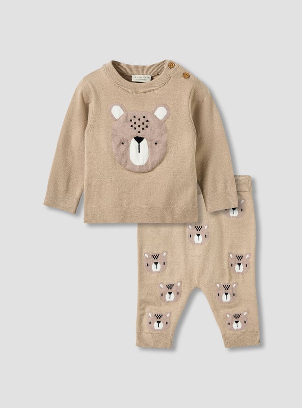 Discover this charming pants set, perfect for keeping your little one comfortable and stylish. The sweater features a delightful bear motif, while the coordinating pants are adorned with an all-over bear pattern, creating an adorable ensemble. Crafted from soft knitwear, this set ensures gentle comfort for sensitive skin, making it ideal for peaceful sleep or relaxed daytime wear. Button closures on the shoulder of the top facilitate easy dressing, providing convenience for parents.