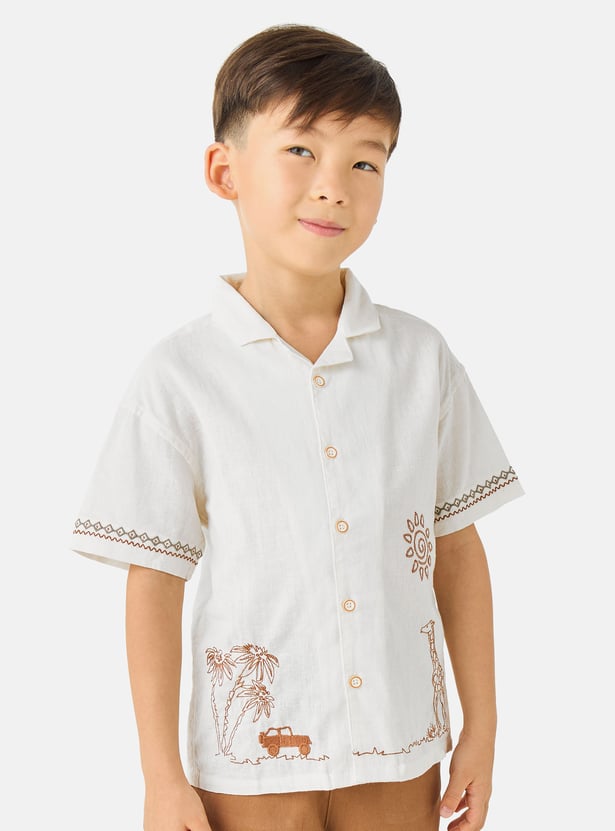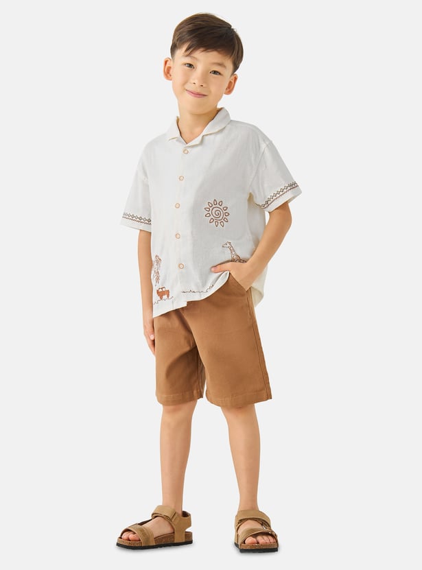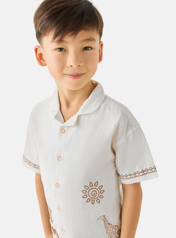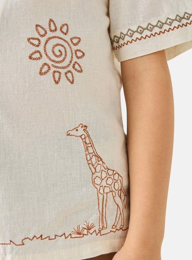 Discover this charming two-piece set for boys, featuring an embroidered short-sleeve shirt and coordinating shorts. The shirt showcases delightful safari-themed embroidery, including a giraffe and palm trees, adding a playful touch to his wardrobe. Crafted for comfort and style, this outfit is perfect for warm-weather adventures.