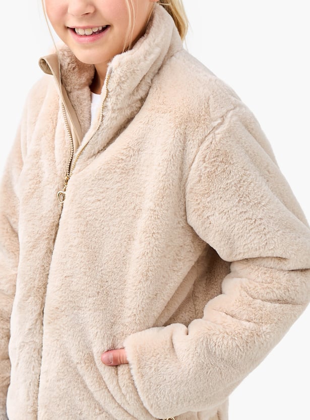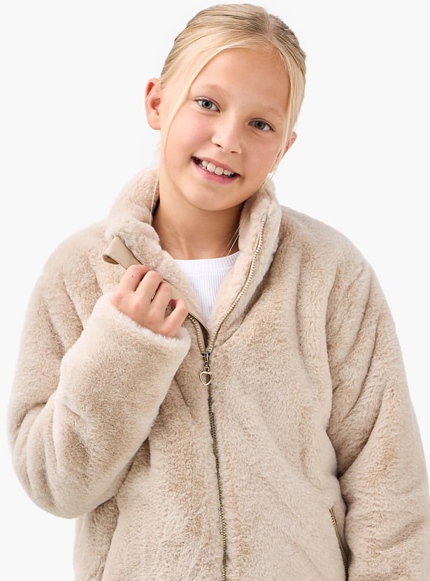 Layer your kid in a cosy style with this jacket for older girls. Made from ultra-soft plush fabric, this jacket offers warmth and comfort on chilly days. Featuring a front zip closure, long sleeves, and handy pockets for added convenience. The relaxed fit makes it perfect for layering over casual outfits. A snug and stylish must-have for her wardrobe.