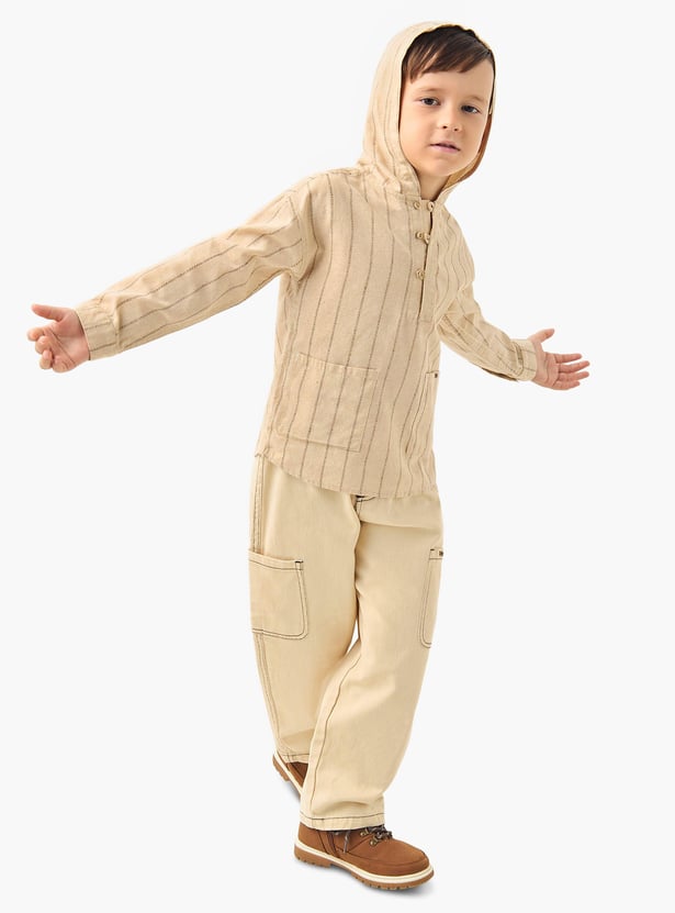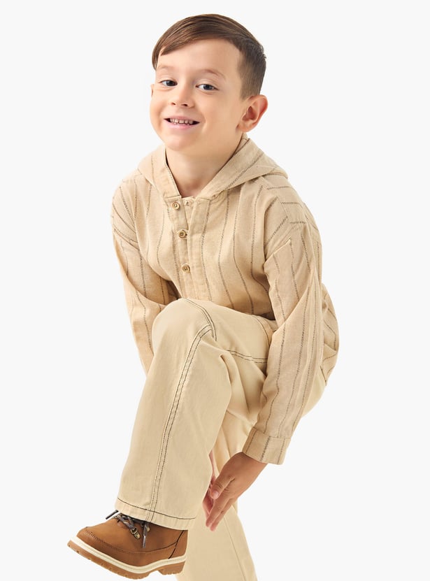 This hooded shirt is perfect for your boy. It's made from soft fabric and features a modern stripe pattern. The long sleeves will keep him warm on chilly days, and the hood will protect his head from the sun.