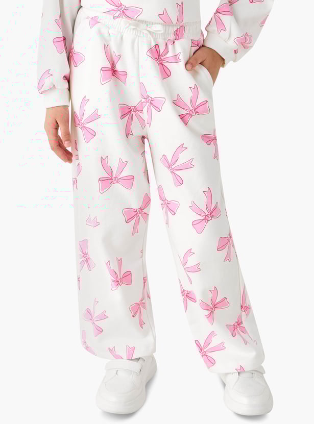 Adorn your little one in these charming bow print track pants, perfect for comfortable everyday wear. Crafted from soft, breathable fabric, these girls' track pants feature an elasticated waist with a drawstring for a secure and adjustable fit. The delightful bow pattern adds a playful touch, making these patterned pants an excellent choice for casual outings or relaxing at home.