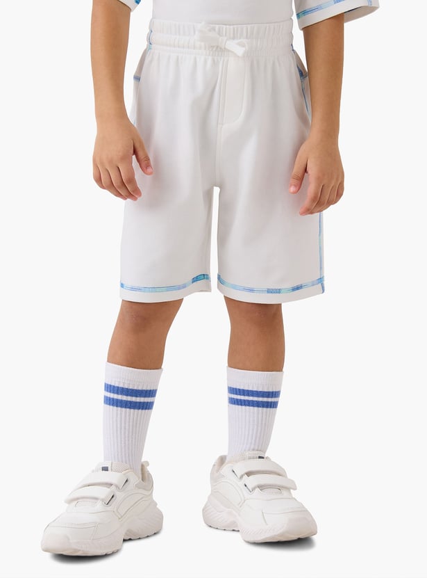 This stylish two-piece boys set includes a crew neck t-shirt and shorts. The set is perfect for playtime and features contrast stitching for a distinctive look. The shorts are designed with a drawstring waist for a comfortable fit, allowing for movement and play. This two-piece set offers both style and comfort, making it an excellent addition to any boy's wardrobe.