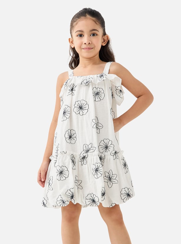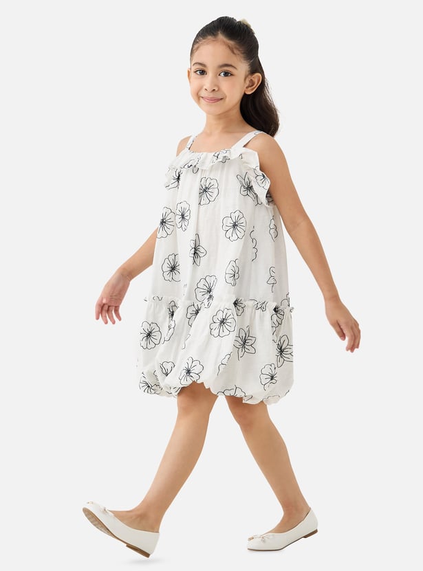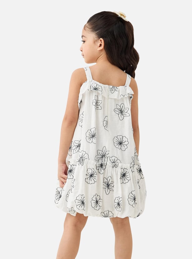 This dress is a charming addition to any wardrobe. It features intricate all-over floral embroidery, adding a delicate, refined touch. The sleeveless design, paired with the balloon silhouette, creates a playful and voluminous look, while the ruffles enhance its appeal. Ideal for casual or special occasions, this dress offers style and comfort, making it a perfect choice for your little one's wardrobe.