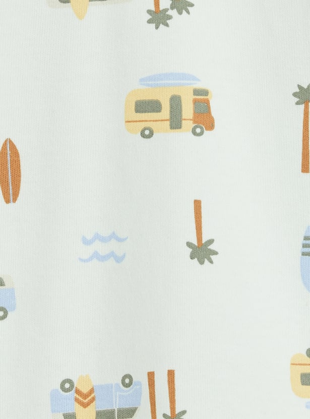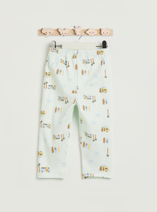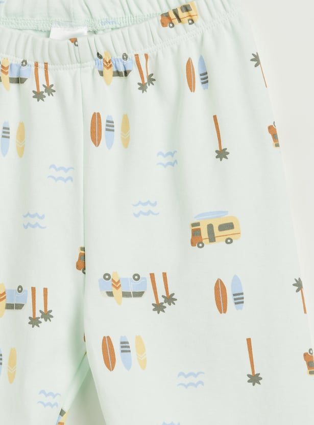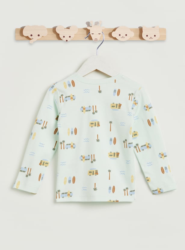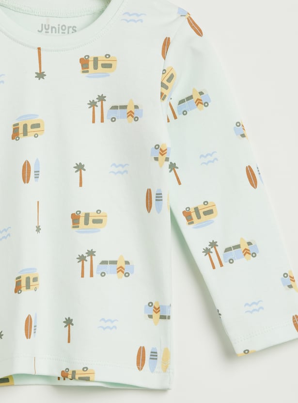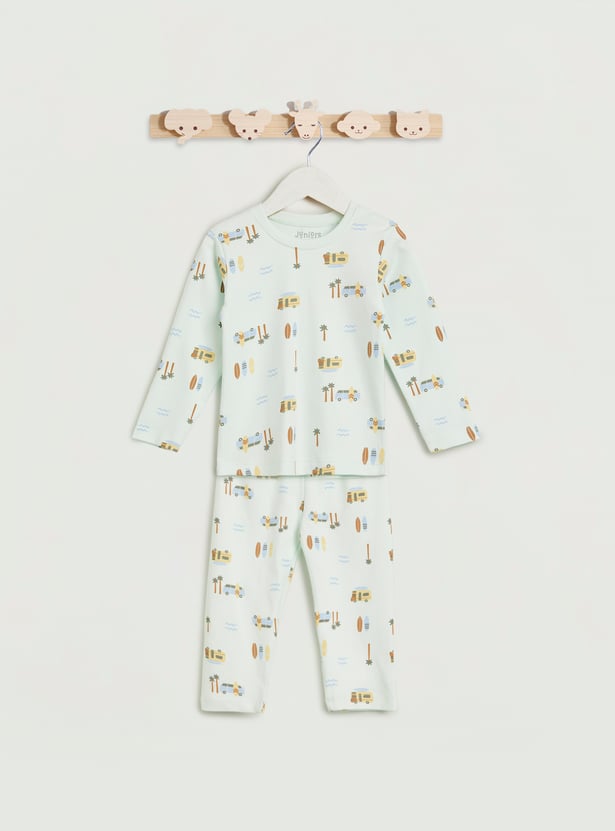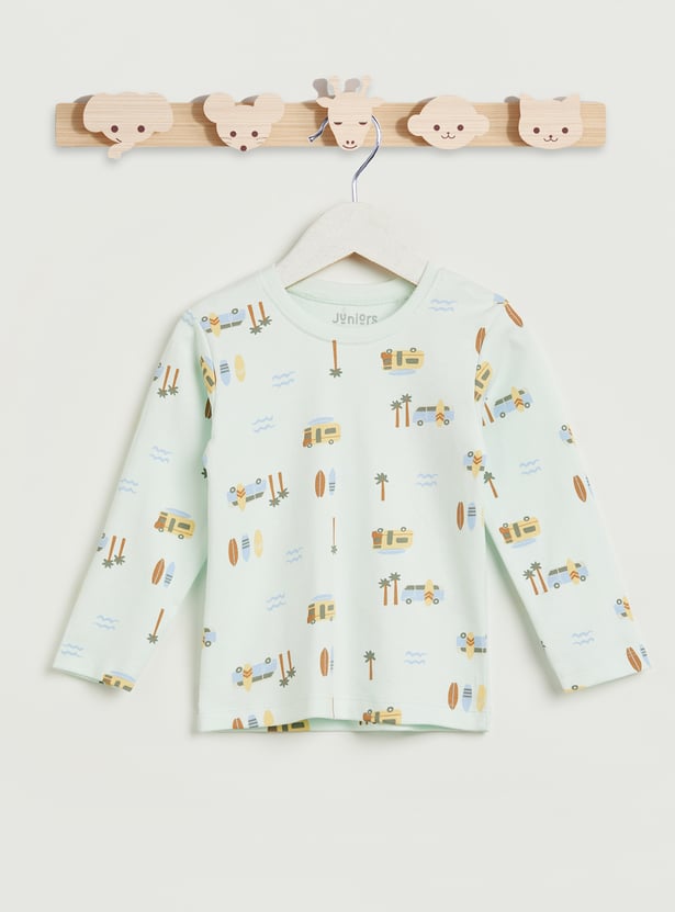 Rev him up for nighttime with this set that includes a holiday-themed print, a crew neck, and full sleeves. It is paired with a matching pair of pyjamas with an elasticated waist. This set is crafted in soft fabric for all-night comfort.
