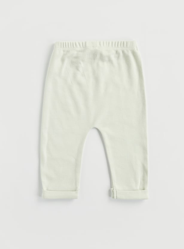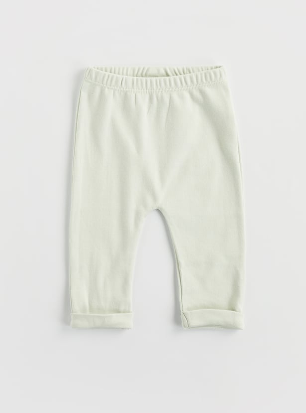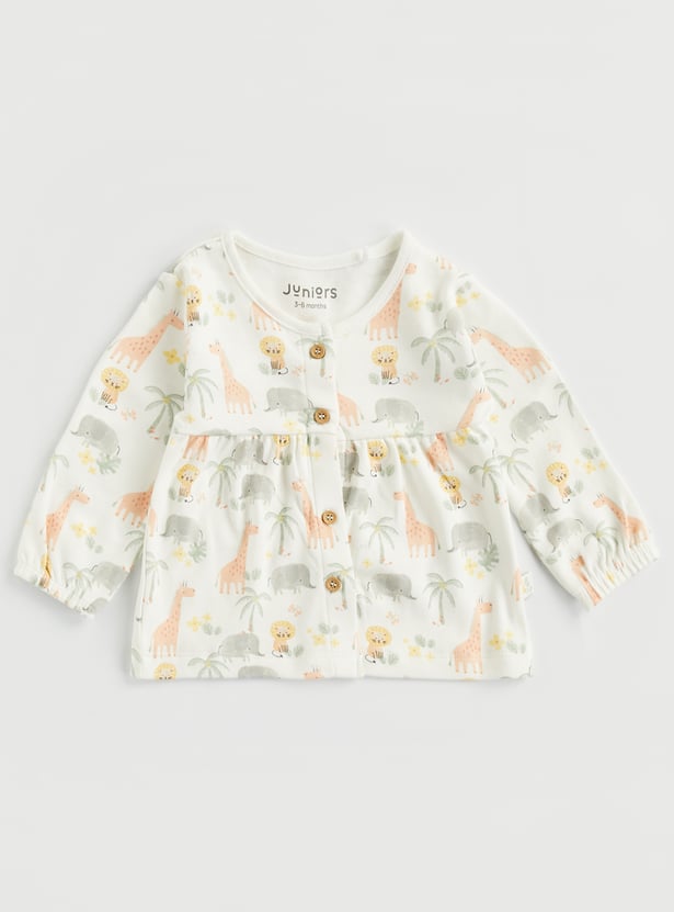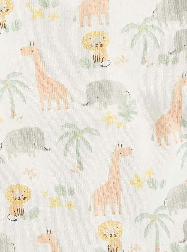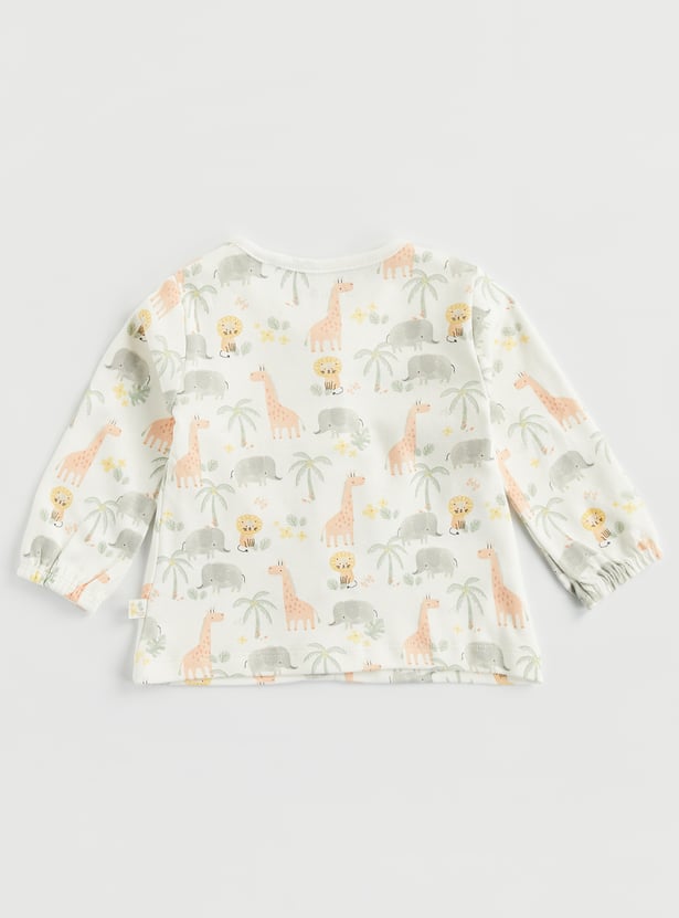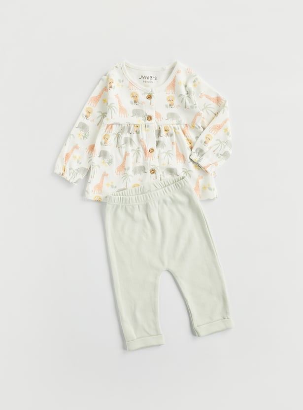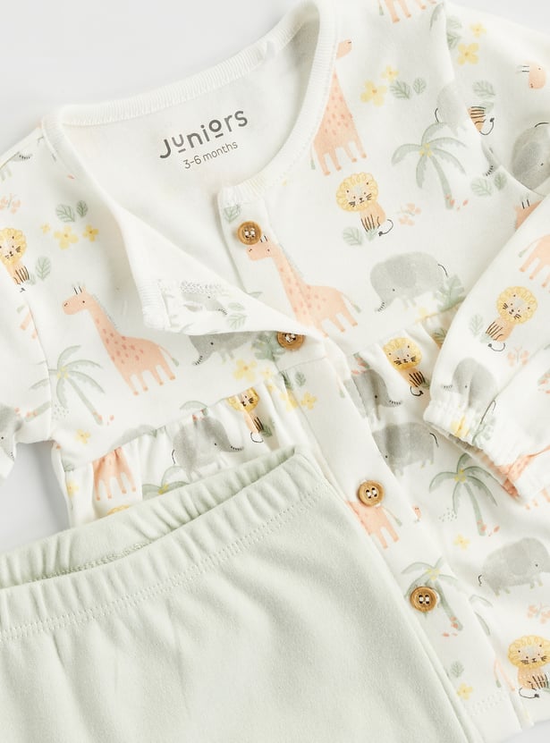 Bedtime just got cuter with this pyjama set. The animal printed top features a round neck and full sleeves. It is paired with pyjamas featuring an elasticated waist and a turned hem.