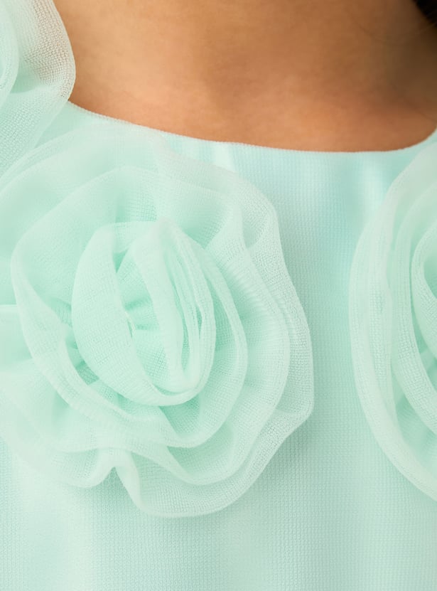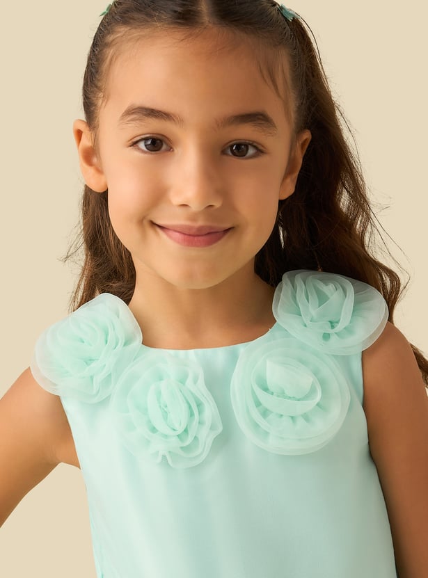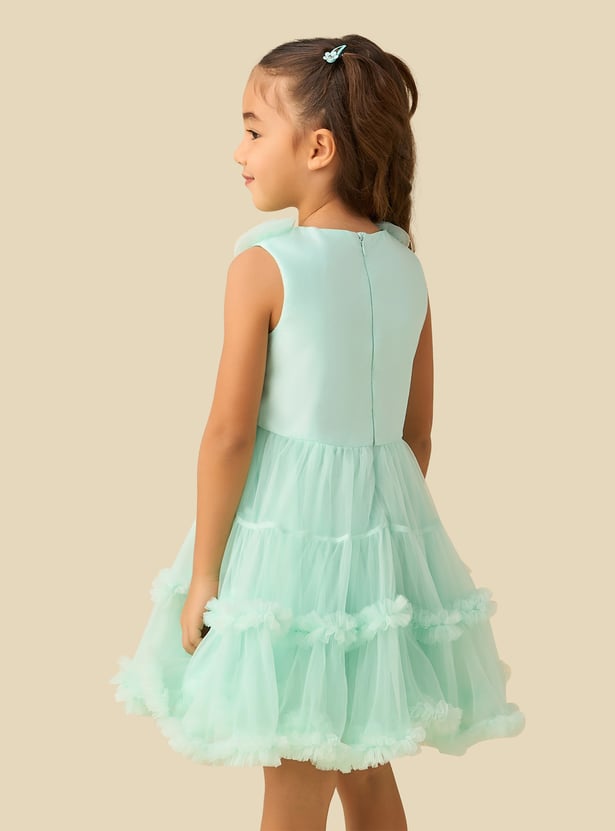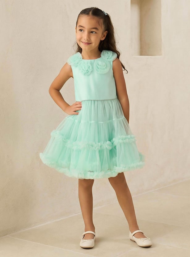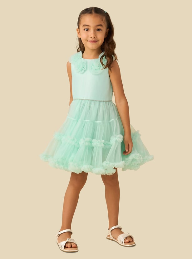 This charming prom dress features a delightful floral ruffle design, perfect for special occasions. The sleeveless silhouette and tiered design creates a whimsical and elegant look for young girls. An invisible zip closure at the back ensures a smooth fit, making this dress both comfortable and stylish.