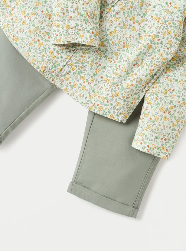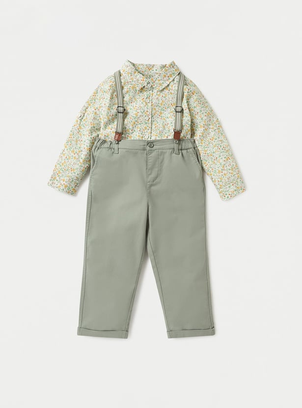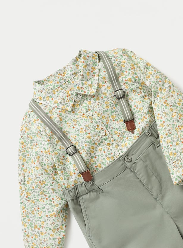 This two-piece set is perfect for your little boy's casual wardrobe. The set includes a long-sleeved printed shirt and a solid dungaree. Made from soft and breathable fabric, this set will keep your child comfortable all day long.