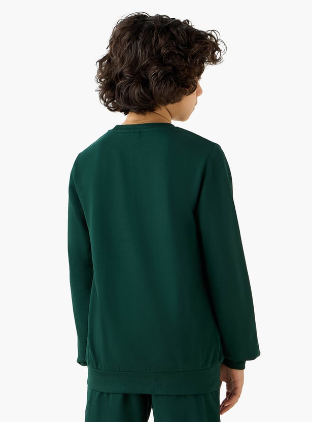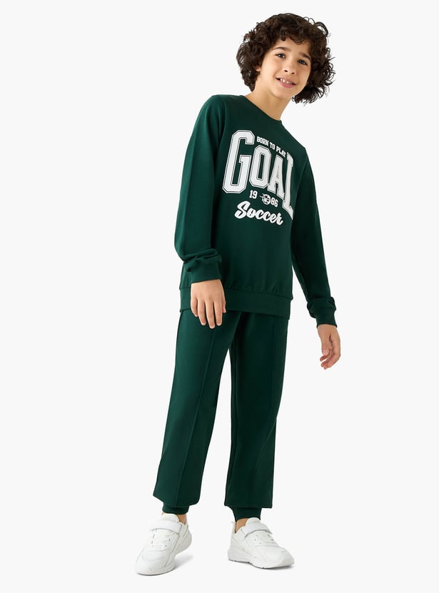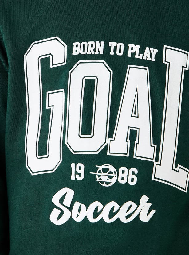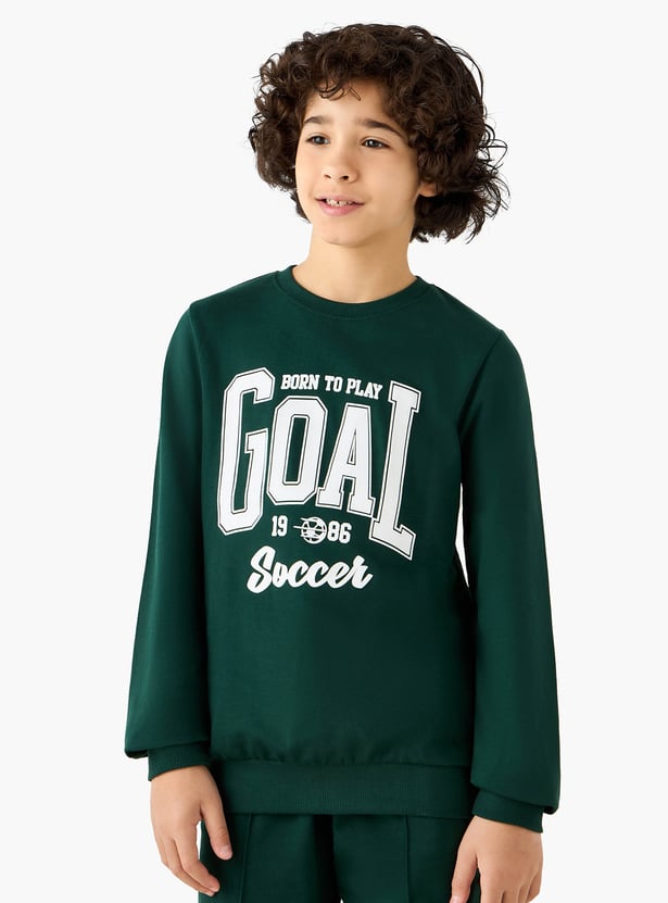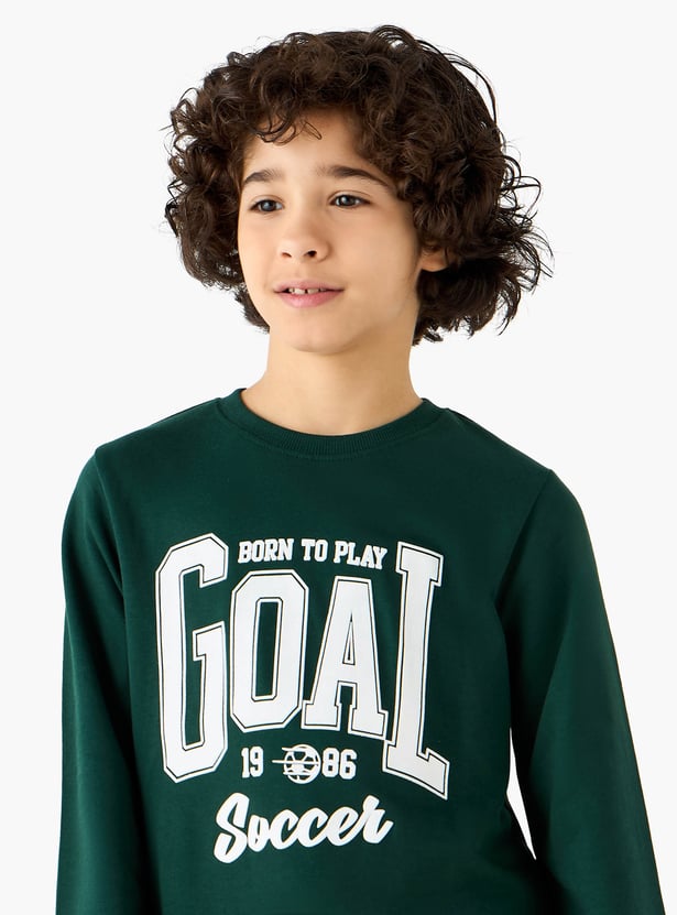 Inspire your young athlete with this comfortable sweatshirt, designed for both active play and casual outings. This long sleeve sweatshirt for boys features a classic crew neck and a bold soccer themed print, allowing them to showcase their passion for the game. The soft fabric construction ensures lasting comfort, while the ribbed cuffs and hem provide a secure fit during any activity.