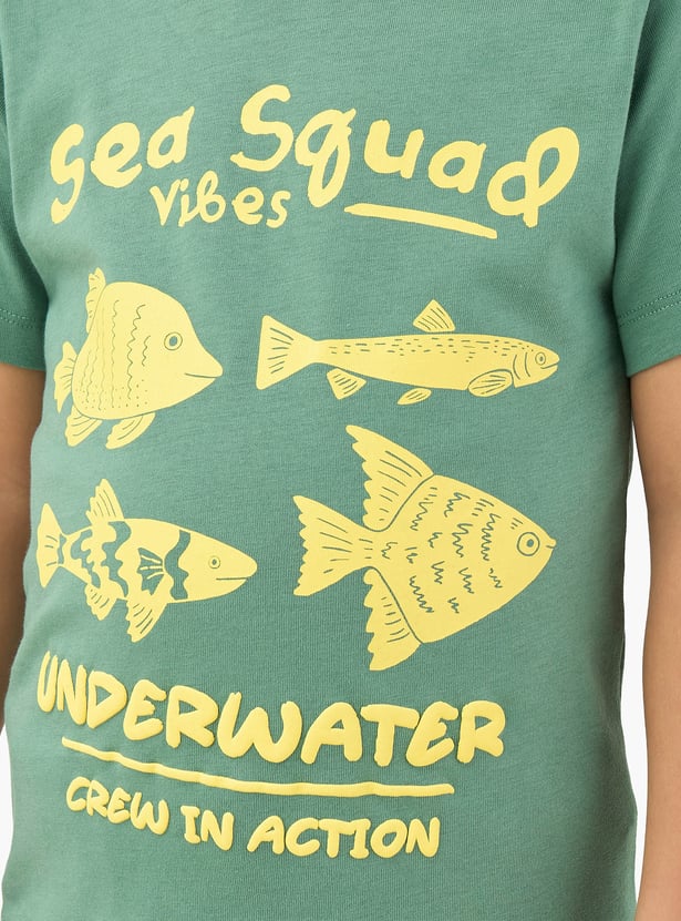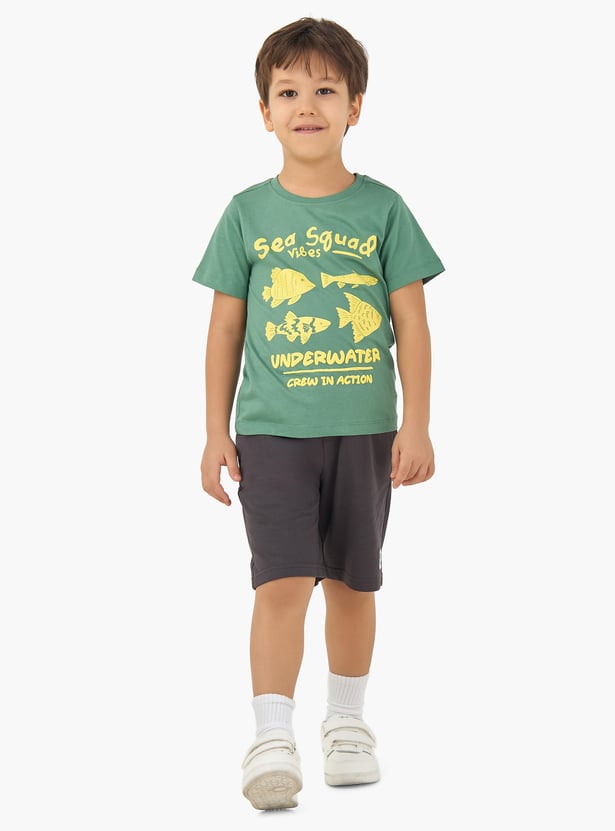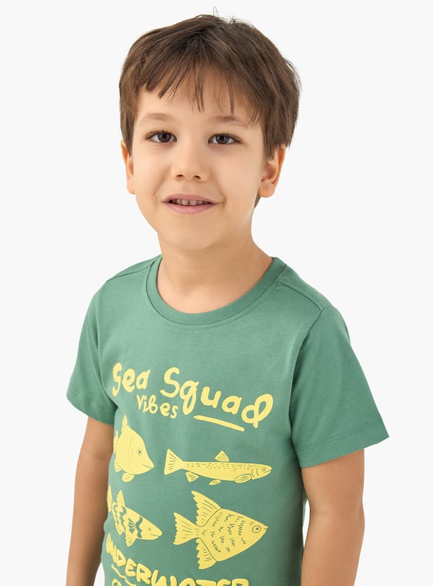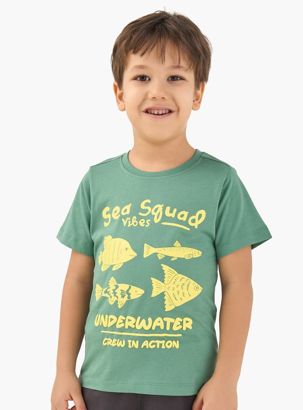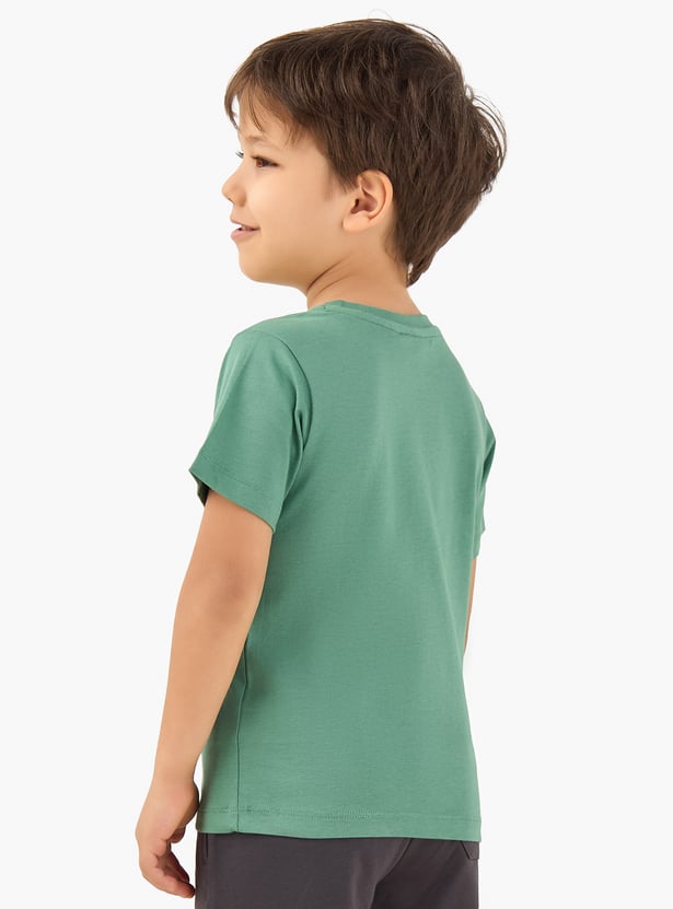 Get your little one vacation‑ready in style! This graphic print T‑shirt features a crew neck and half sleeves, made from soft fabric to keep him comfortable all day.