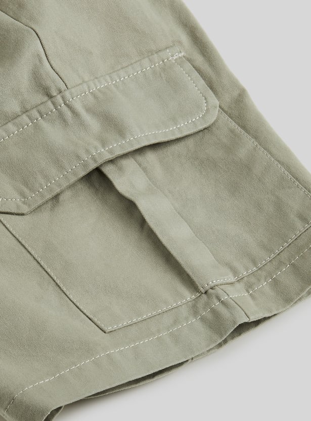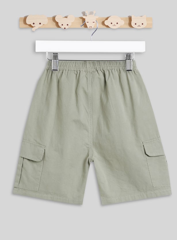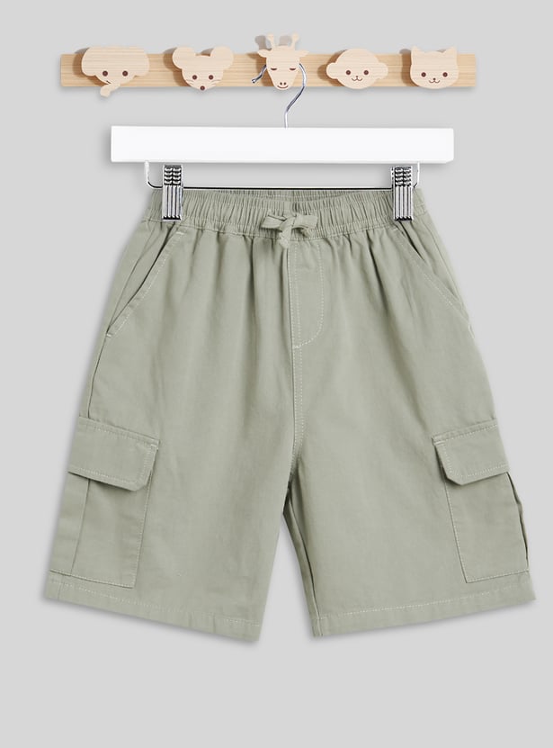 These solid cargo shorts offer a practical and comfortable style for everyday wear. Designed with a drawstring waist and cross pockets, they provide a secure and adjustable fit. The flap pockets add a classic cargo touch while offering extra storage for small essentials. It is crafted from soft fabric for comfort.