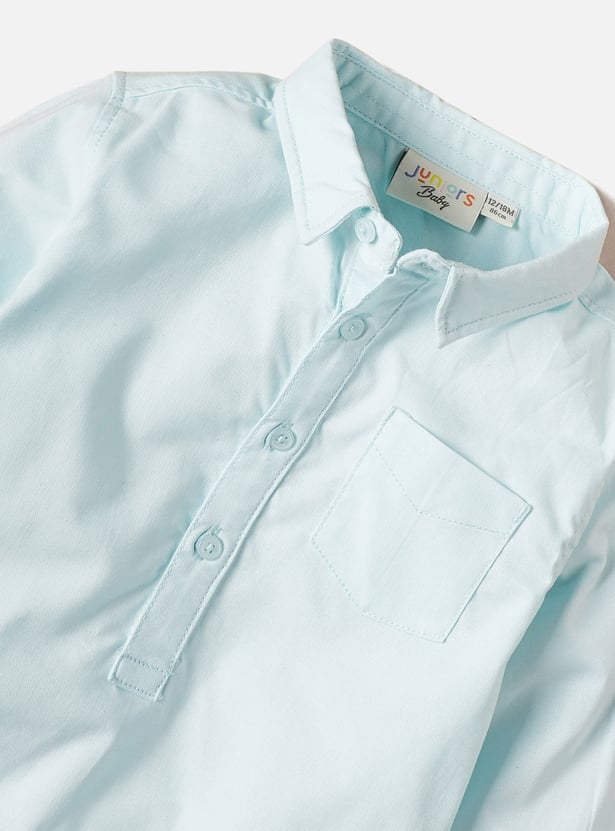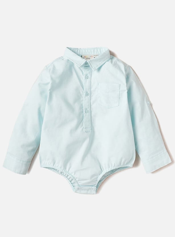 This bodysuit ensures that your baby is happy and cosy all day. The shirt-style piece features a collared neckline and snap diaper buttons. It also features full sleeves and a chest pocket.