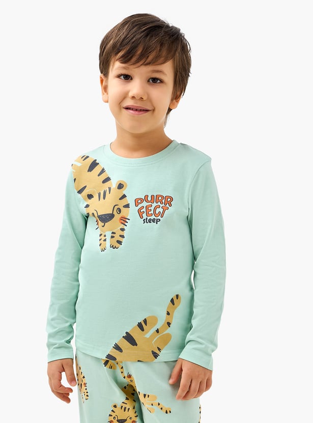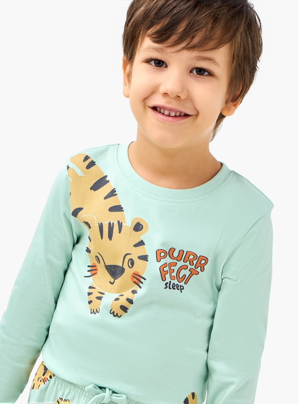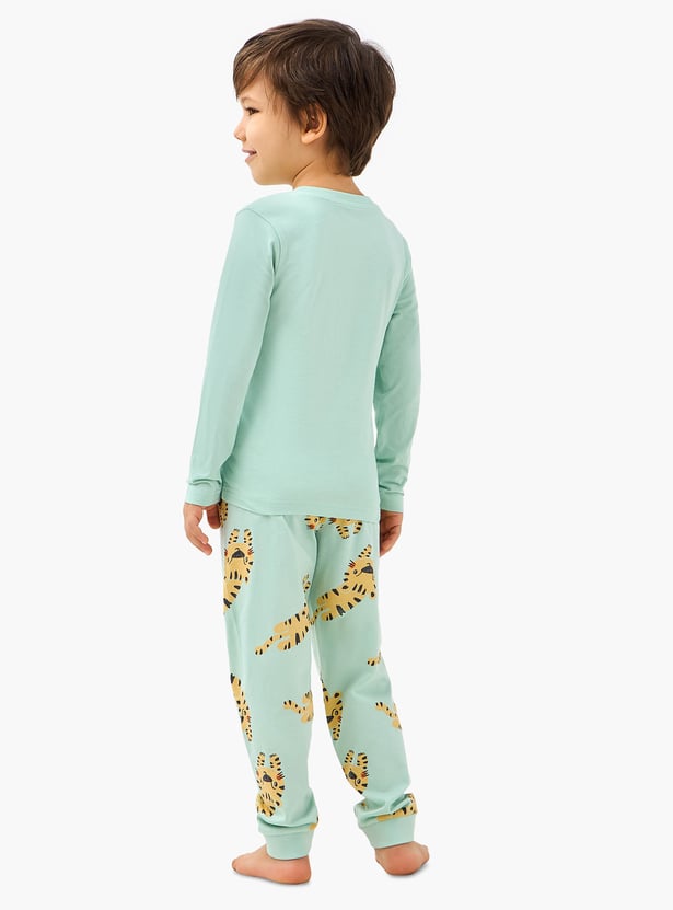 Ensure restful nights with this soft and comfortable joggers set. This two-piece set features a playful tiger print and long sleeves for warmth and cosiness. The drawstring waistband ensures a snug fit, allowing for unrestricted movement during sleep.