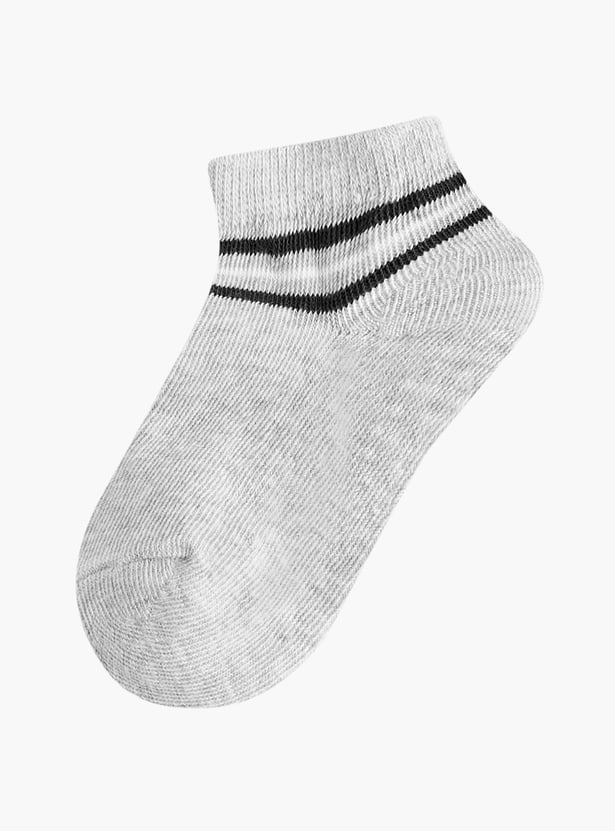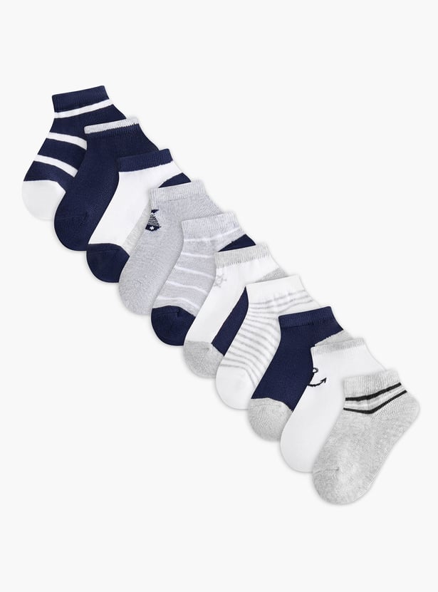 These assorted ankle-length socks are a fun and comfy choice for kids, featuring sailing, striped, and colourblock designs. The set includes ten pairs, offering a variety of styles to match every outfit. Soft and stretchy, these socks provide all-day comfort and durability for active feet.
