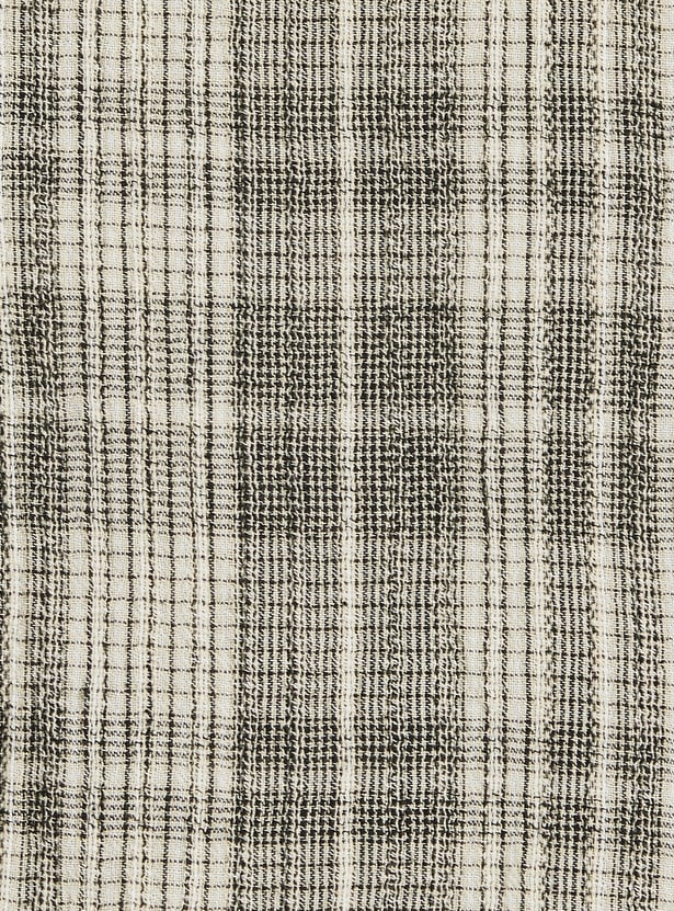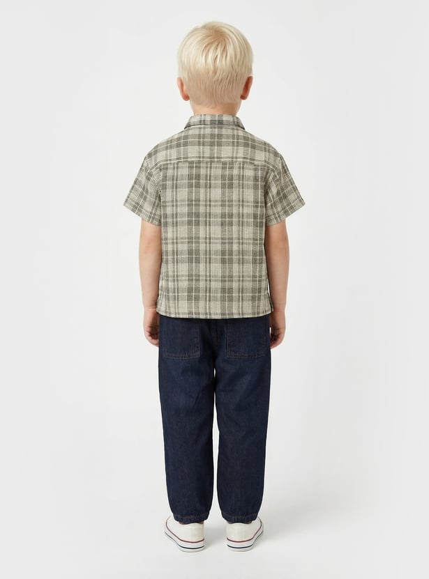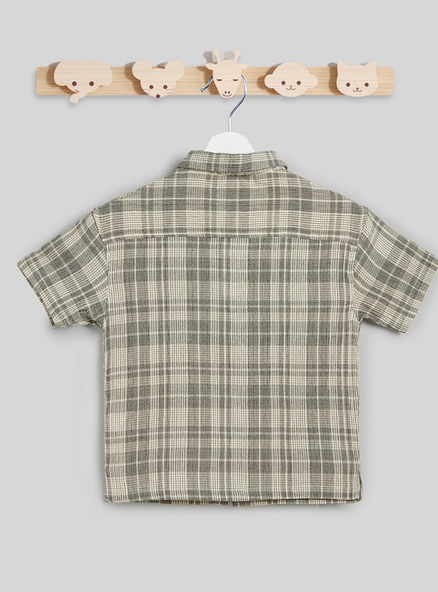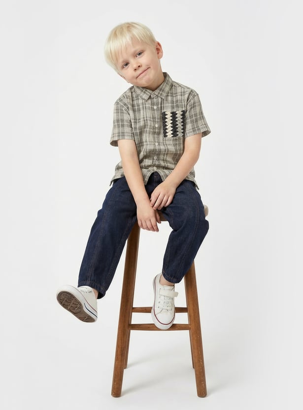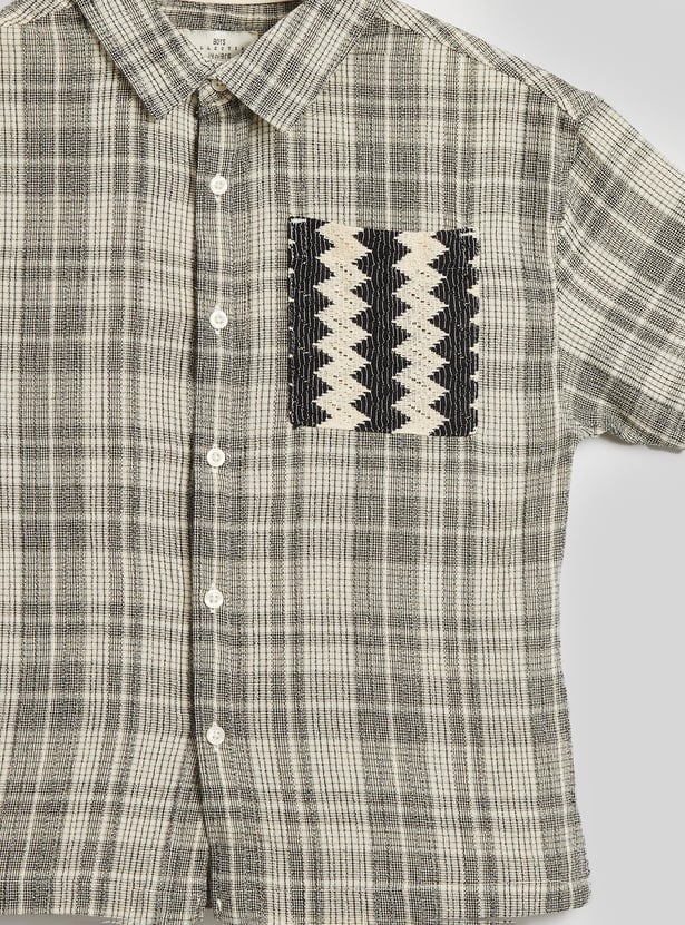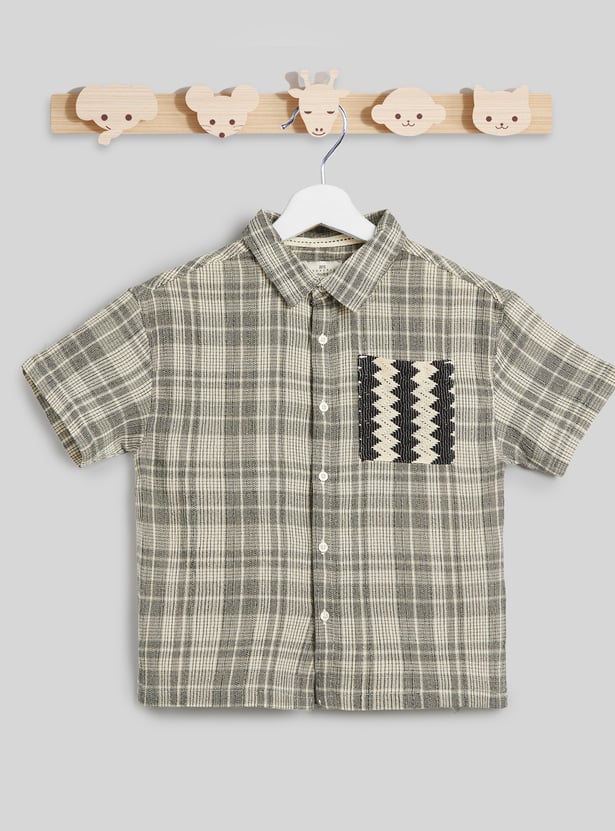 This checked shirt features a spread collar, half sleeves, and a full button placket, accented with a charming crochet pocket for a touch of handcrafted detail.