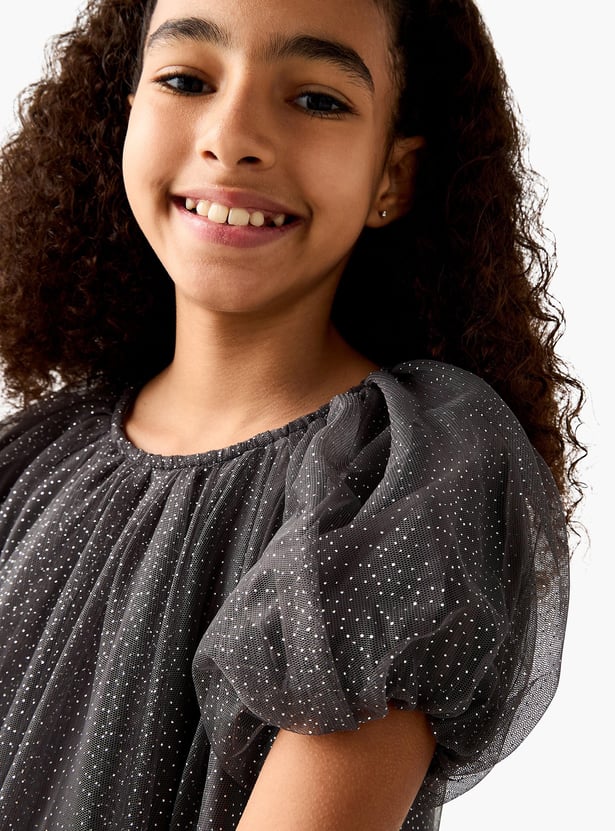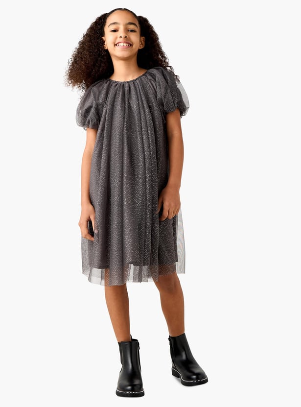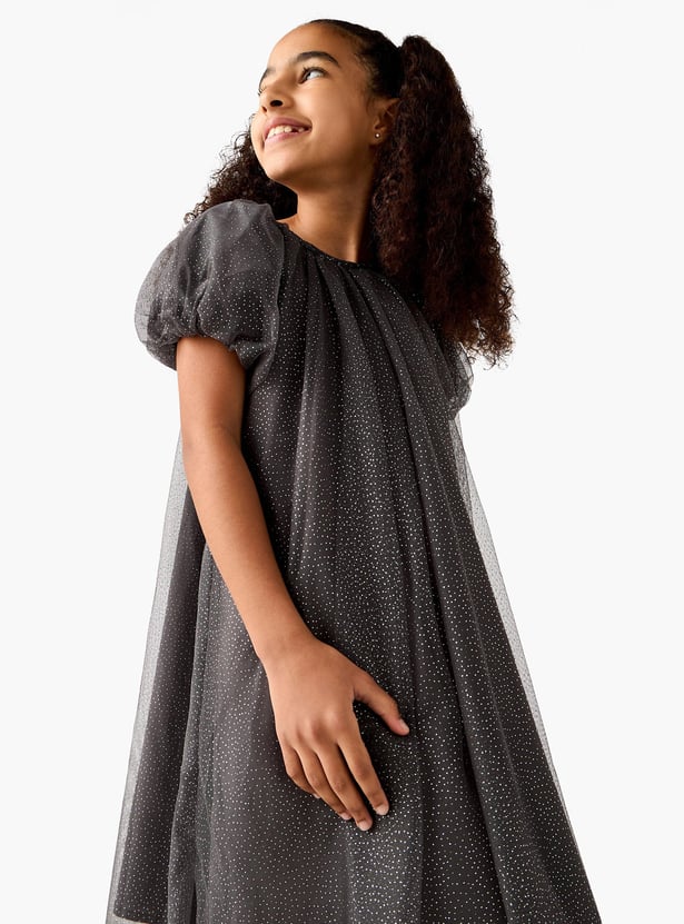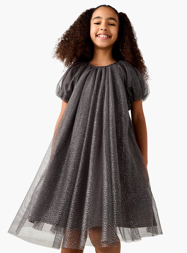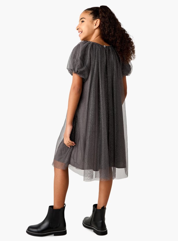 Juniors Embellished A-line Dress with Round Neck and Short Sleeves