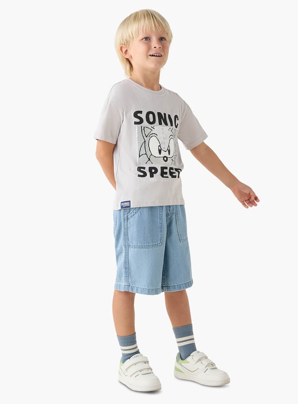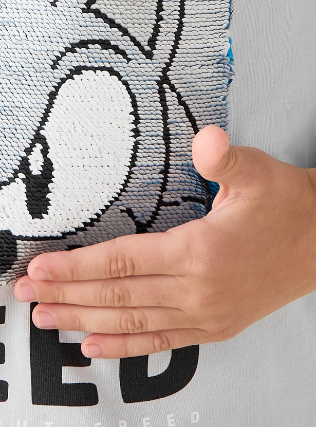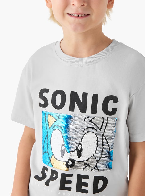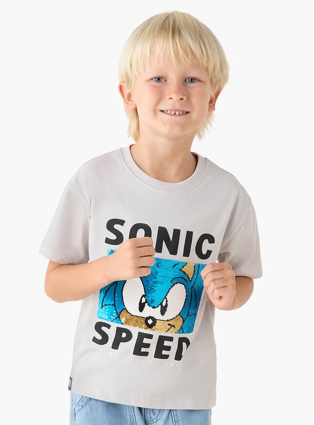 Unleash adventure with this T-shirt, featuring a captivating Sonic the Hedgehog flip sequin design. Designed with a crew neck and half sleeves. Crafted from soft, breathable fabric, this tee ensures all-day comfort.