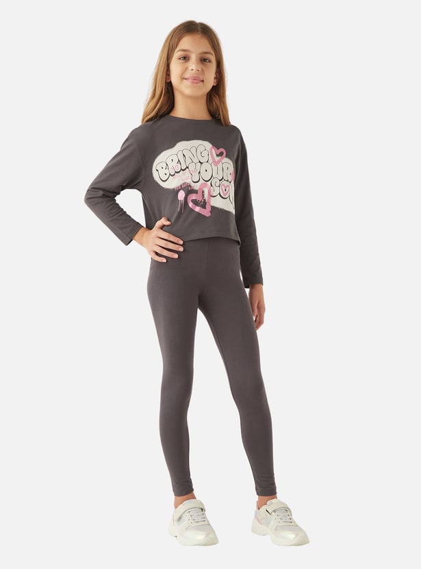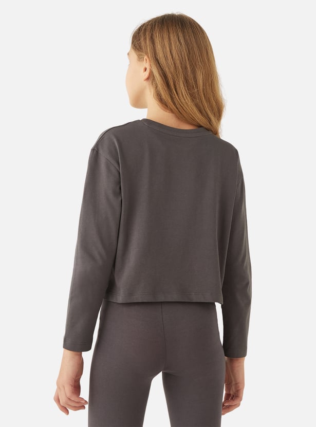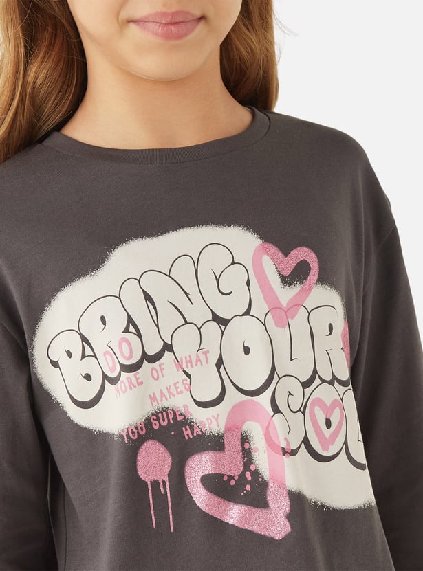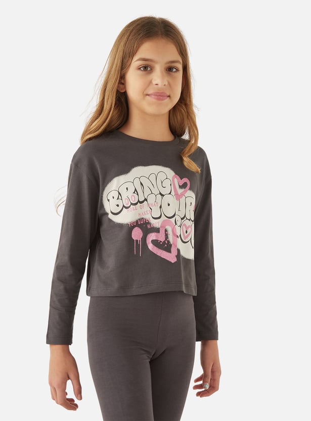Juniors Graphic Print Round Neck T-shirt with Long Sleeves