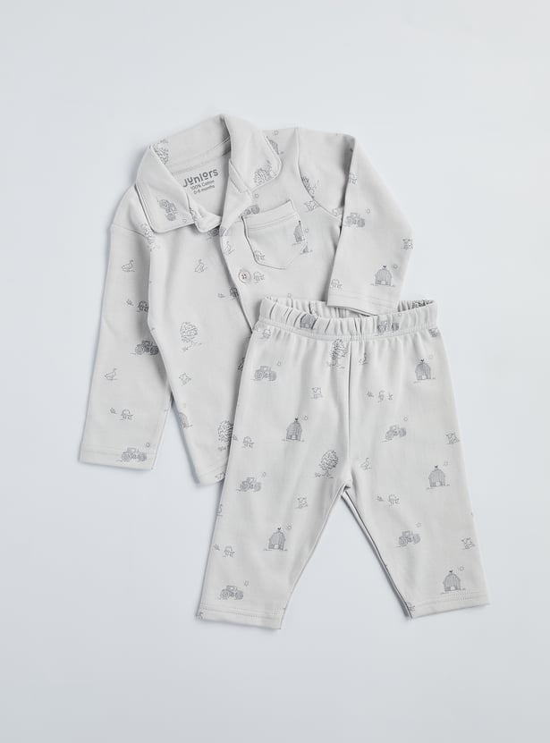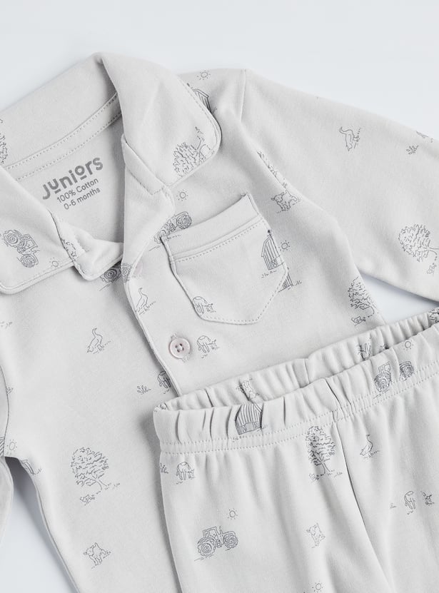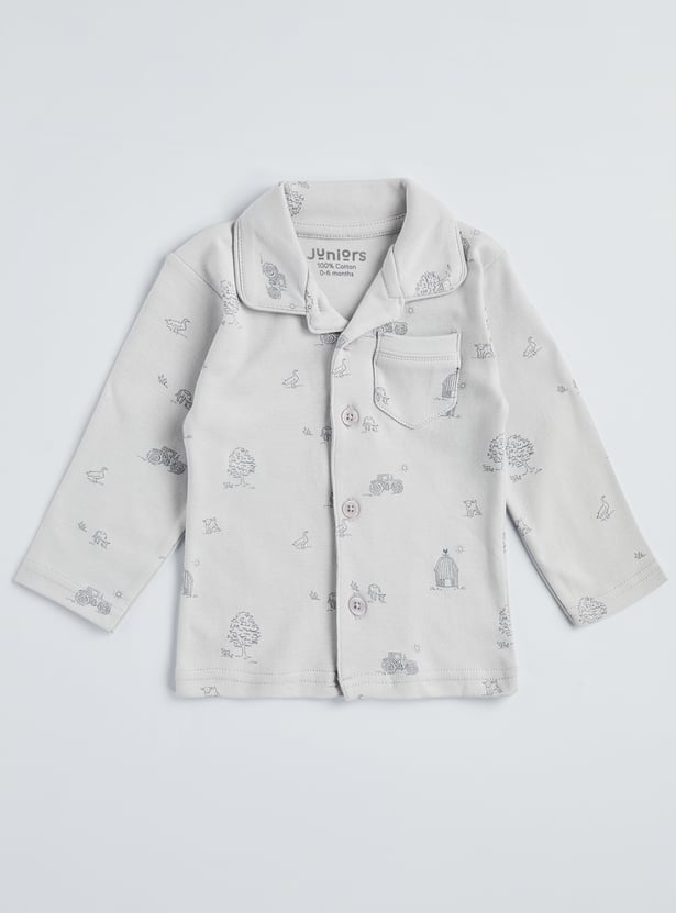 Add fun to bedtime with this printed pyjama set, featuring a smart collared shirt with full sleeves, button placket, and patch pocket, paired with matching pyjamas with an elasticated waist. Designed for comfort and ease, it’s the perfect blend of playful style and cosy wear.