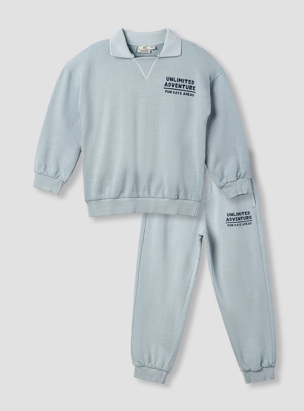 This two-piece set offers exceptional comfort and style for active youngsters. The long-sleeved sweatshirt features a classic johnny collar and a print, while the coordinating joggers include an elasticated waist with a drawstring for a secure fit. Crafted from soft, durable fabric, this matching set is ideal for everyday wear, providing warmth and flexibility for all their adventures. The ribbed cuffs and hem ensure a snug fit, making this a practical and stylish addition to any young boy's wardrobe.