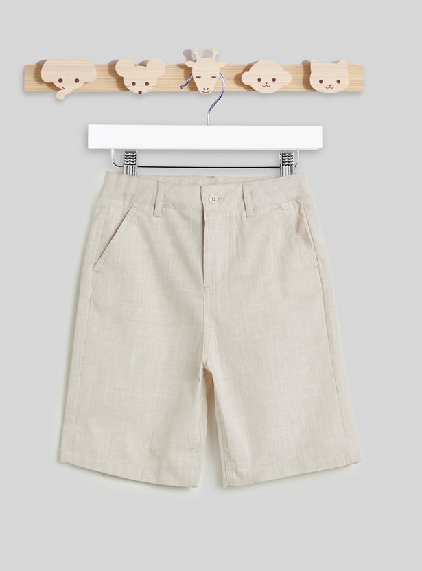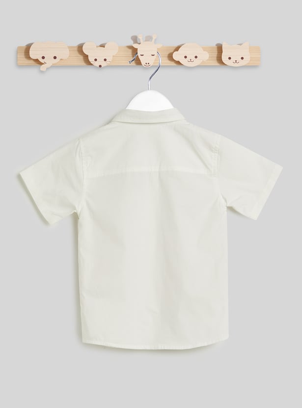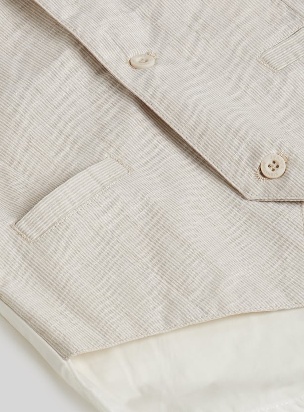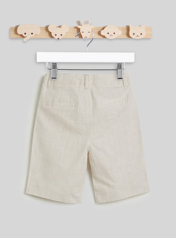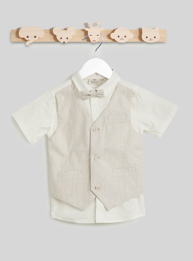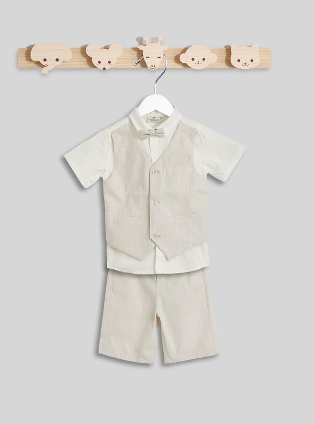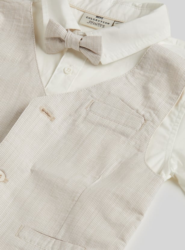 This striped woven shirt and shorts set offers a smart and stylish look for special outings. The shirt features a layered checked waistcoat, a spread collar, and half sleeves for a polished appearance. The shorts feature a flat front, belt-loop waist, and cross pockets. The bow tie adds a smart finish. The soft fabric ensures comfortable wear throughout the day.