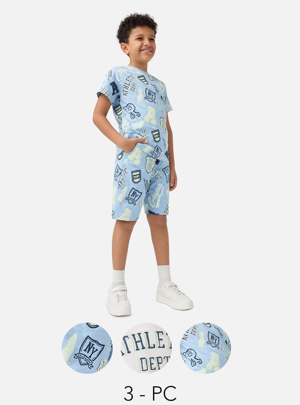 Refresh your boy's wardrobe with this three-piece set, featuring two printed t-shirts and one pair of shorts. Made from soft, breathable fabric, these pieces ensure all-day comfort for active play and casual outings. Combining fun prints with practical wear, this set is perfect for versatile and stylish dressing.