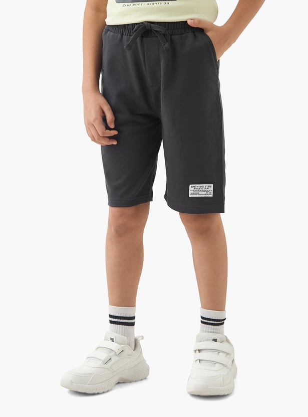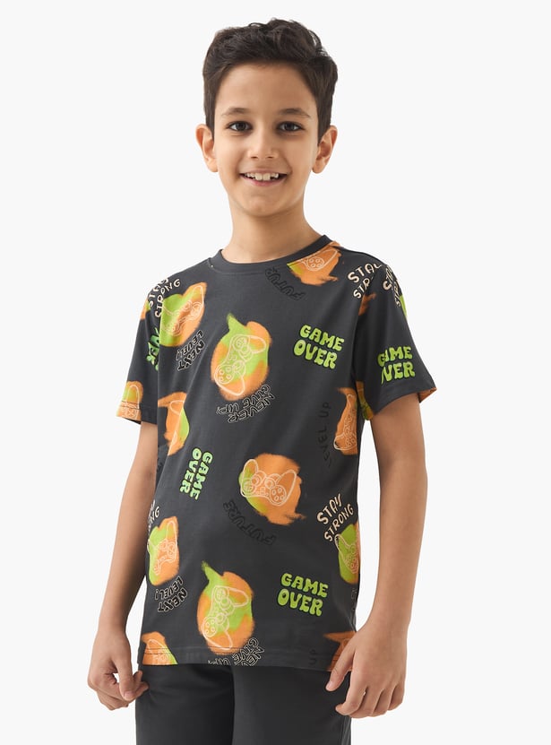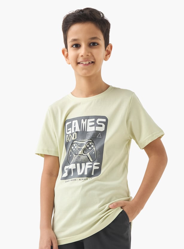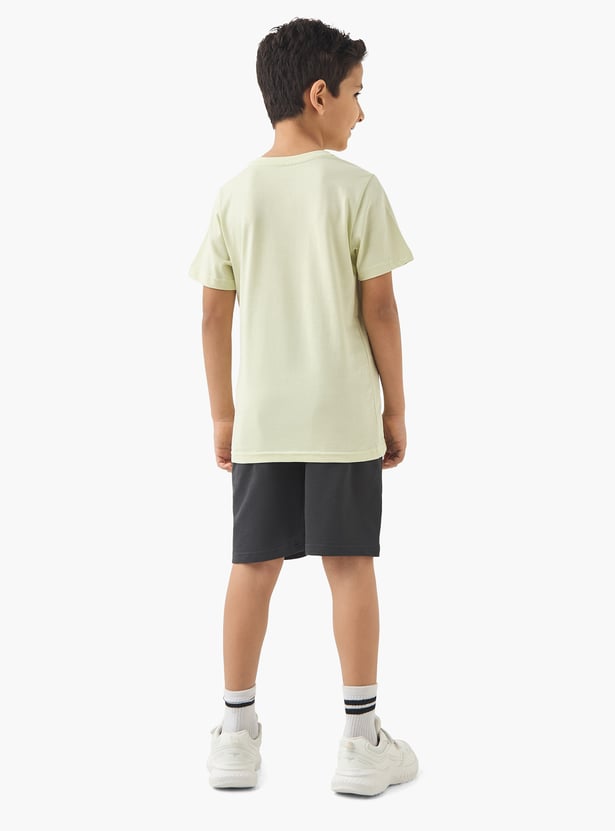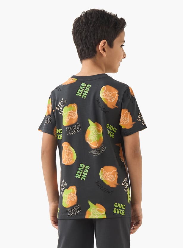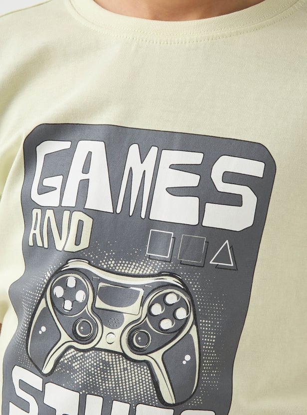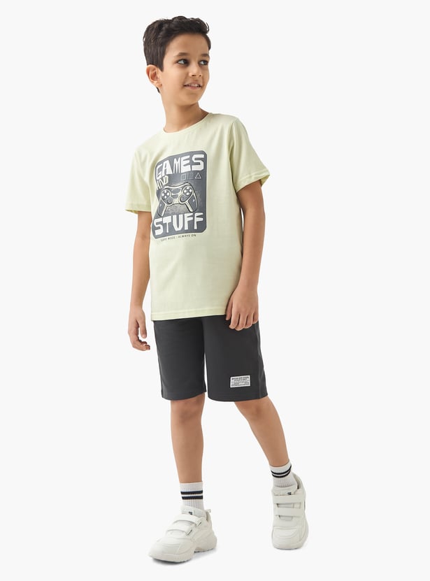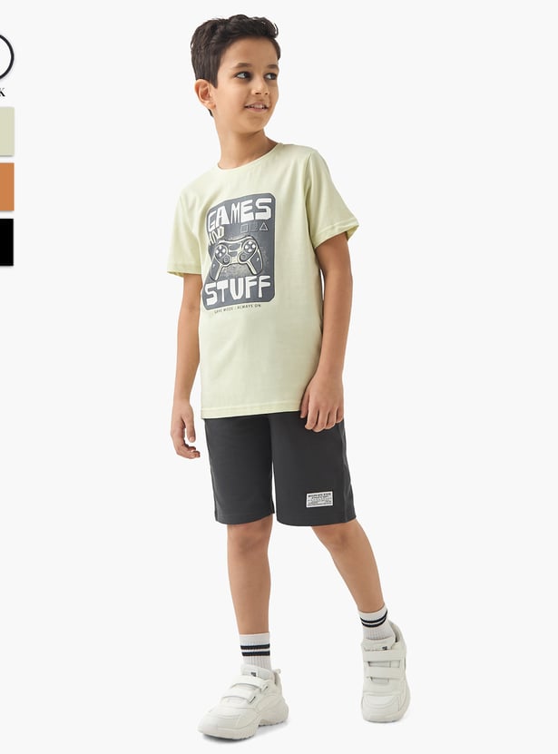 Level up his everyday look with this fun 3-piece set. It includes two T-shirts in assorted tones, each featuring bold video game prints for extra personality. The knee-length shorts come with side pockets and a drawstring waist for a comfy, adjustable fit.