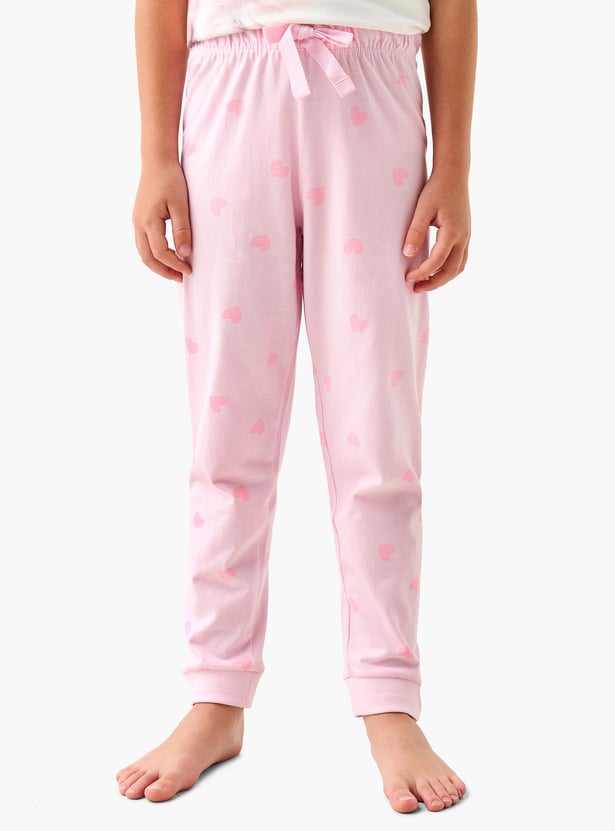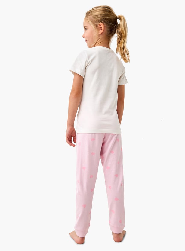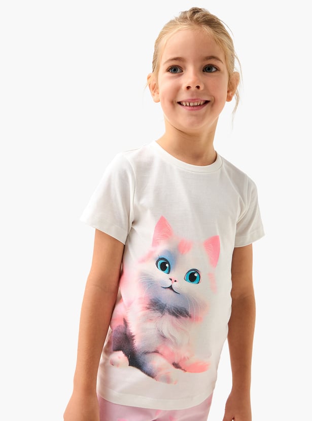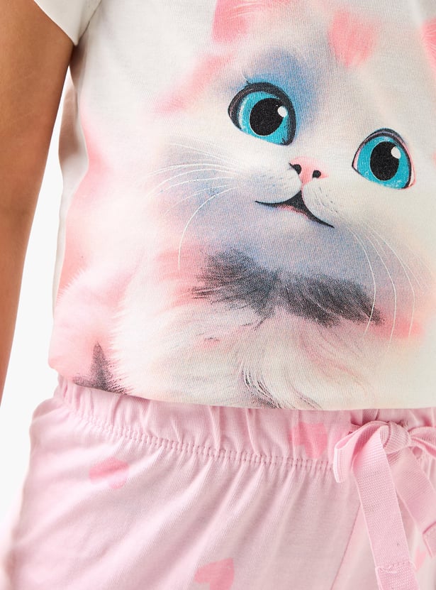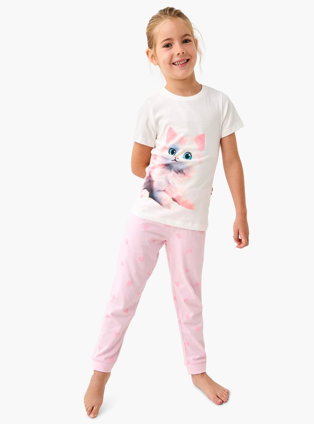 This delightful set includes a charming cat print t-shirt and cosy heart print pyjamas, perfect for young girls. Made from soft fabric, these pieces ensure comfort during sleep and play. The short sleeves offer breathability, while the adorable graphic adds a playful touch. Easy to care for, this set will become your daughter's favourite.
