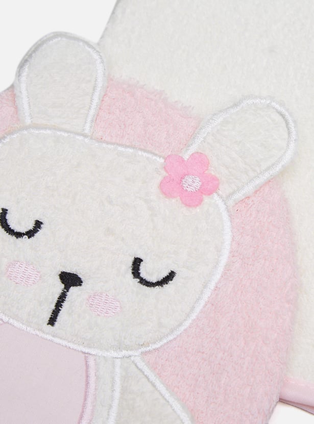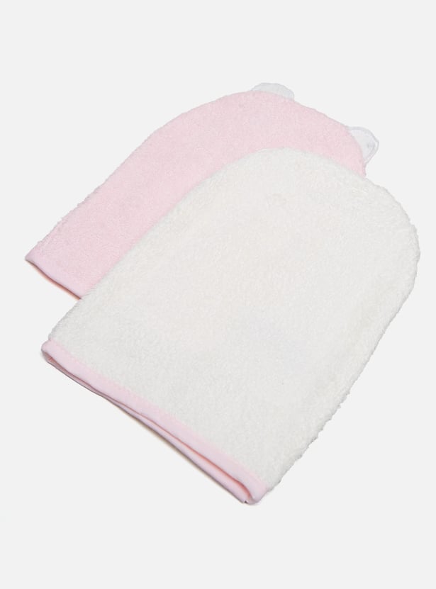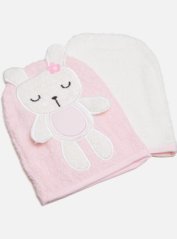 Made from soft fabric, this set of two Juniors wash mittens is a must-have for your baby's bath-time routine. The assorted pack includes an embroidered-patch bunny design and a solid style. The wash mittens will make it easy to bathe your baby.